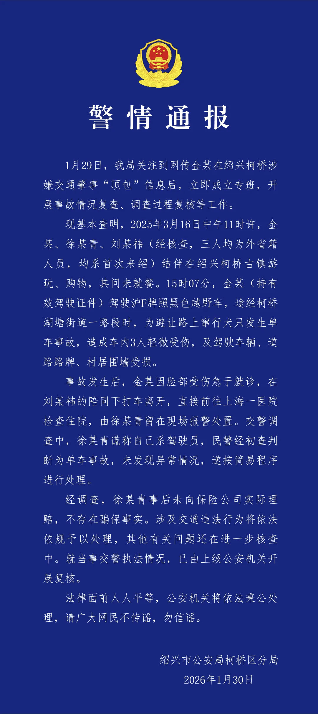 警方通报金晨事件 如果事情真像警方和金晨描述的那样,是可以理解的。1.这是单方面事故,没有造成其他人损伤;2.对车辆和路牌、墙壁等损失,金晨个人进行了赔偿;3.没有酒驾等其他违法行为;4.作为艺人伤到脸上,第一时间赶去医院处理怕留疤可以理解;5.助理主动担责,也是怕影响艺人形象。
