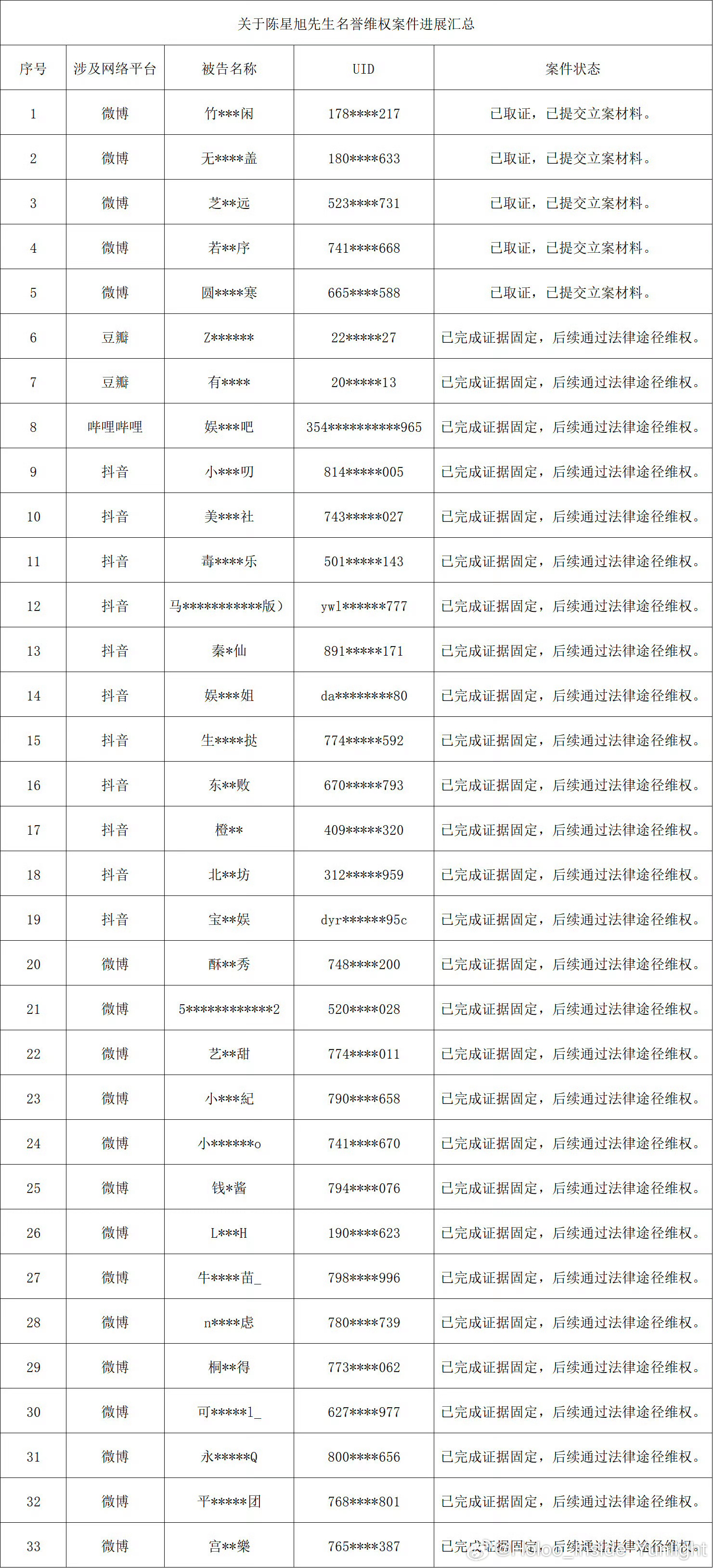 陈星旭工作室告黑了,已提交立案材料的5个,完成证据固定的28个,微博、豆瓣、痘印