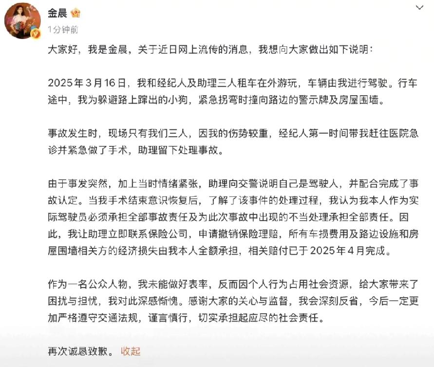 辟谣了!警方通报金晨交通事故,金晨本人也同时道歉回应,不是故意肇事逃逸、找人顶包,也没有故意骗保!而是当时金晨受伤了,急着去就医,助理一个人留在现场,处理交通事故,谎称自己开的车,与金晨没关系,事后金晨也承认了是自己开的车,要求向保险公司撤案,不要求理赔,造成的警示牌损毁、撞村民的墙等损失,全部都是自己赔付!可见金晨被冤枉了,网传得很邪乎,其实就是一起普通的交通事故,根本远远没有大家想的那么严重!现在真相大白,大家散了吧!