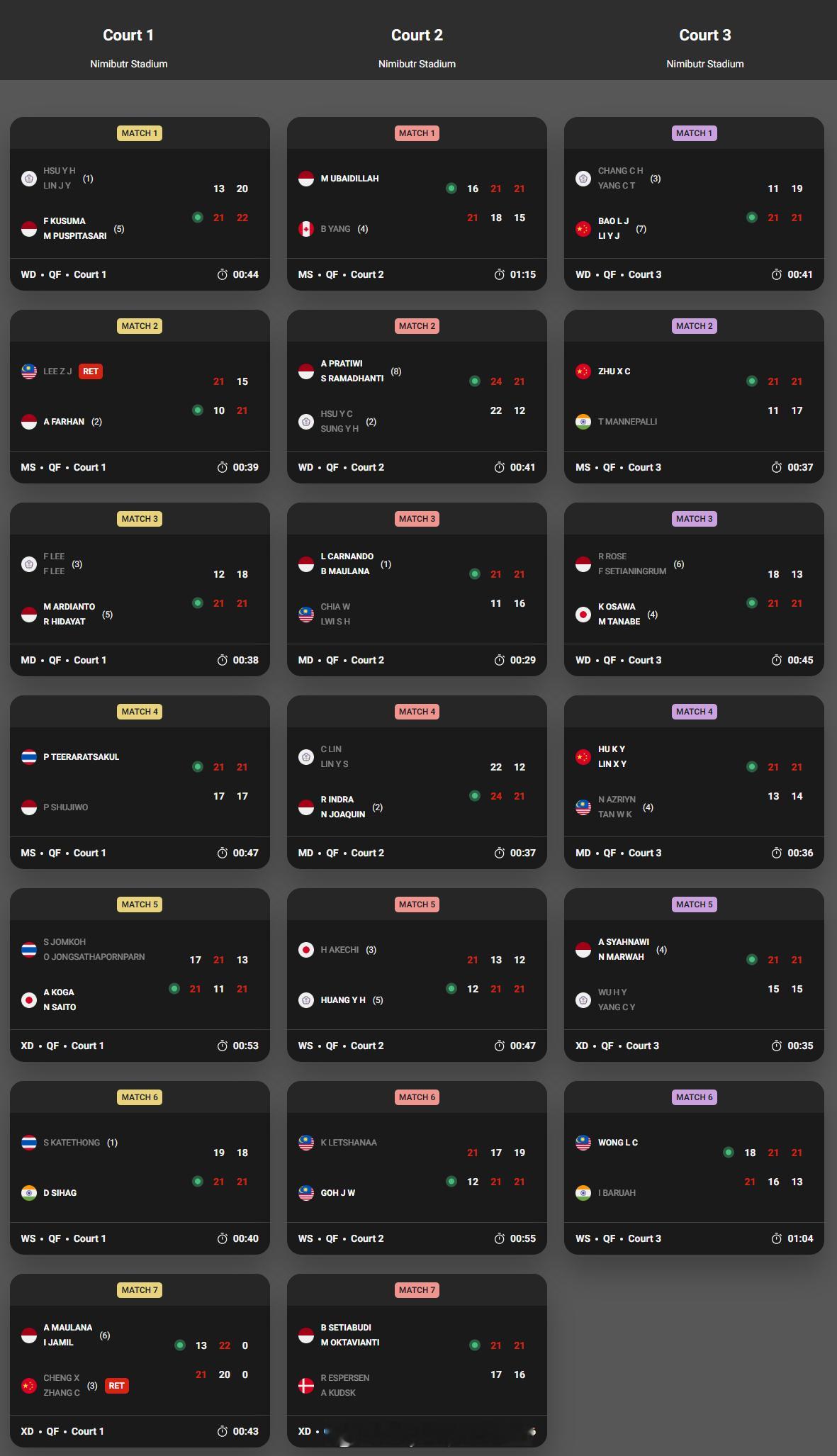 【泰国大师赛1/4决赛国羽3胜1负】2026年泰国羽毛球大师赛羽联超级赛 1月30日曼谷,世界羽联超级300泰国大师赛结束1/4决赛,国羽取得3胜1负战绩,国羽赛果如下,完全赛果见图:男单:朱轩辰21-11/21-17曼内帕里(印度)男双:胡珂源/林祥毅21-13/21-14阿兹林/陈蔚强(马来西亚)女双:鲍骊婧/李怡婧21-11/21-19张净惠/杨景惇(中国台北)混双:程星/张驰(退赛)21-13/20-22毛拉纳/贾米尔(印尼)