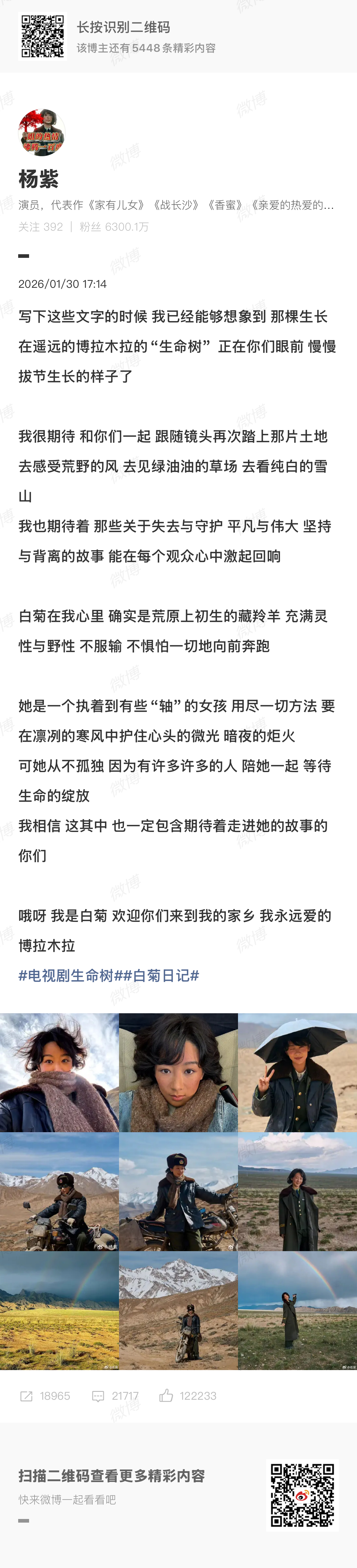 杨紫生命树开播长文生命树开播 《生命树》今晚开播,杨紫发长文表示:写下这些文字的时候,已经能够想象到那棵生长在遥远的博拉木拉的“生命树” 正在你们眼前,慢慢拔节生长的样子了。“我很期待 和你们一起 跟随镜头再次踏上那片土地 去感受荒野的风 去见绿油油的草场 去看纯白的雪山,我也期待着 那些关于失去与守护 平凡与伟大 坚持与背离的故事 能在每个观众心中激起回响。”📺杨紫kk的星朋友