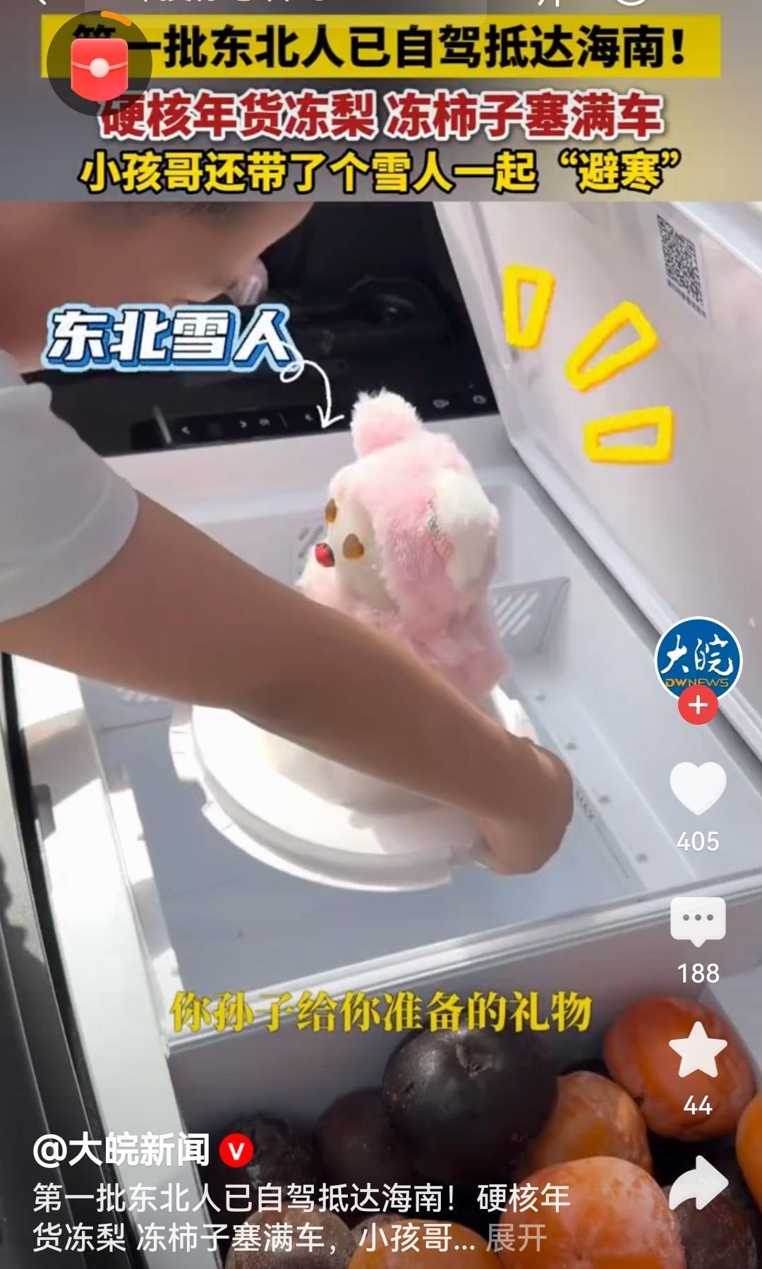 第一批东北人已自驾抵达海南从冰天雪地到椰风暖阳,载着冻梨、冻柿子和雪人一路向南,这趟自驾奔赴的不仅是温暖,更是藏在烟火气里的浪漫。南北温度的碰撞,让这个冬天充满了鲜活的快乐与感动。[比心][比心][比心] 东北人在海南 评论打卡任务