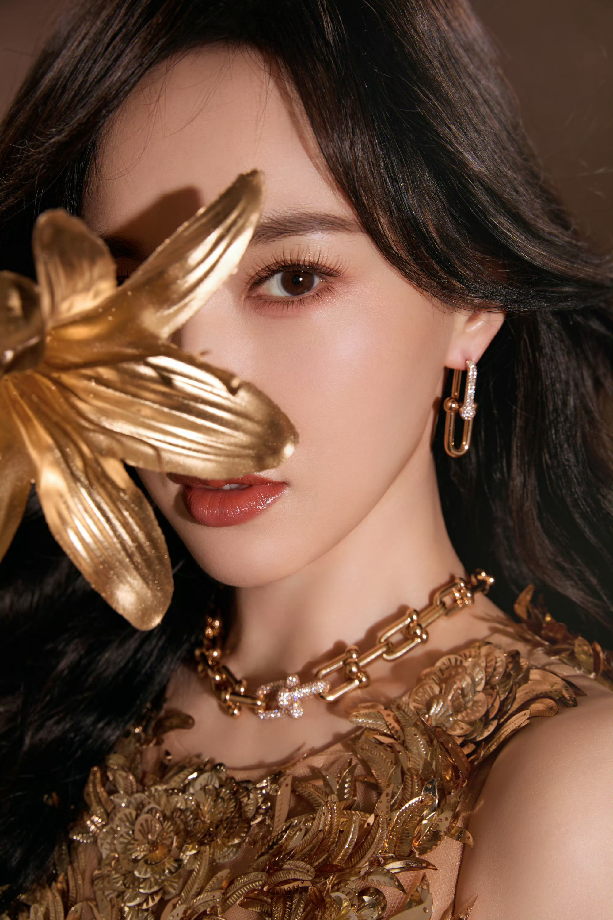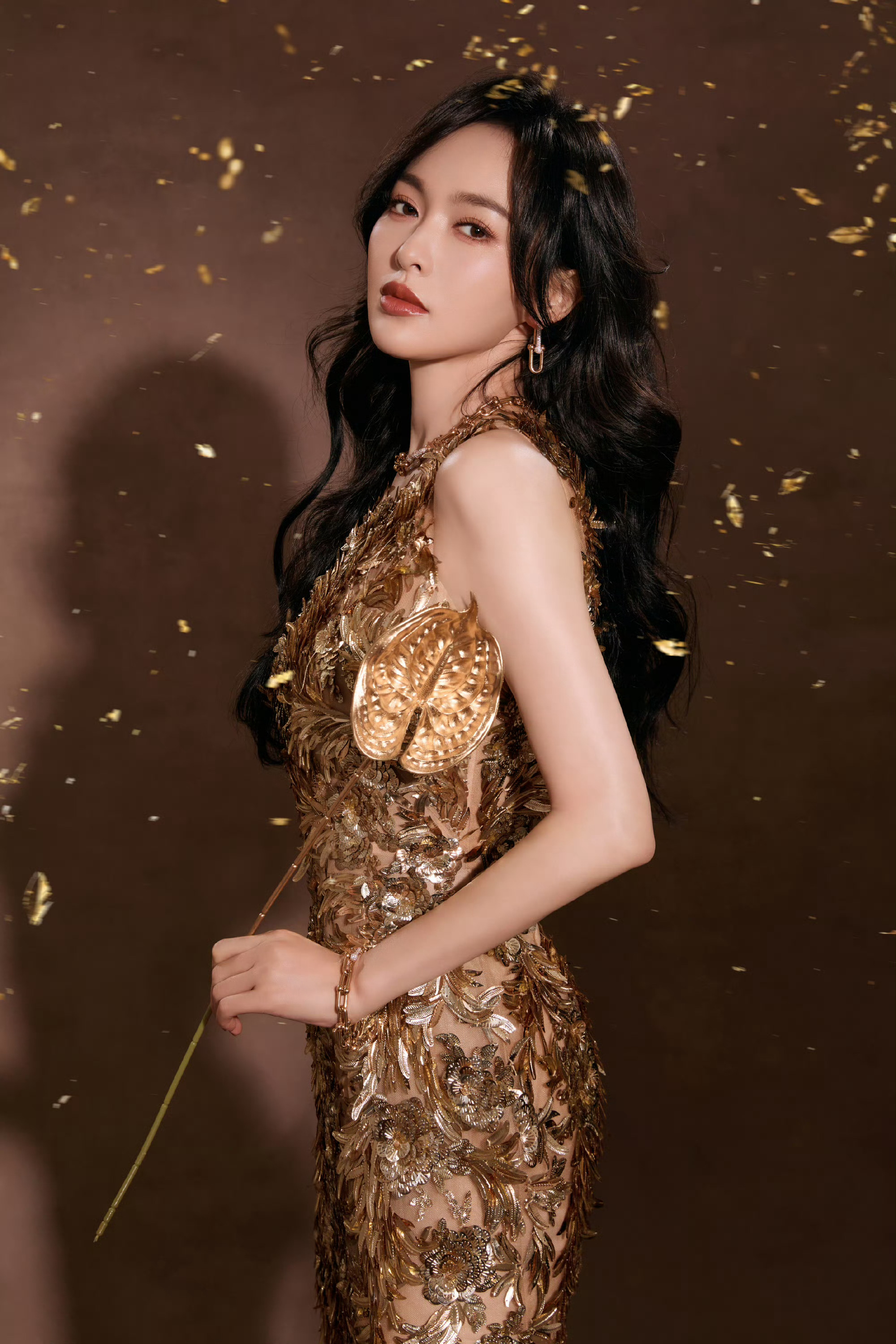 唐嫣身穿 Oscar de la Renta 2025秋冬金色无袖花叶刺绣开叉裙亮相巴黎欧莱雅品牌年会