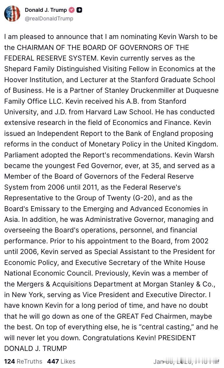 突发新闻:美国总统特朗普宣布提名前美联储理事凯文·沃什为美联储主席候选人,接替即将卸任的鲍威尔。 特朗普发帖写道: “我认识凯文很久了,我毫不怀疑他将成为美联储历史上最伟大的主席之一,甚至可能是最伟大的主席。他简直就是完美人选,绝对不会让人失望。” 媒体评论: 1,特朗普提名凯文·沃什接替杰罗姆·鲍威尔担任美联储主席。这次任命,可能会撼动美联储的超能力:信誉和独立性。 2,凯文·沃什与共和党政府关系密切,被广泛认为与特朗普时代的经济思想一致。 3,这是唐纳德·特朗普试图控制美联储。 4,凯文·沃什既即是美联储资深人士,也是华尔街的资深人士。 与此同时,凯文·沃什的妻子是化妆品巨头雅诗兰黛的直系继承人,其岳父罗纳德·兰黛与特朗普是沃顿商学院的同学,也是收购格陵兰岛的提议者。 特朗普的传记作者Tim O’Brien也说过,“任何时候,只要某人与有权有势或有名的人有联系,对特朗普来说都至关重要。”