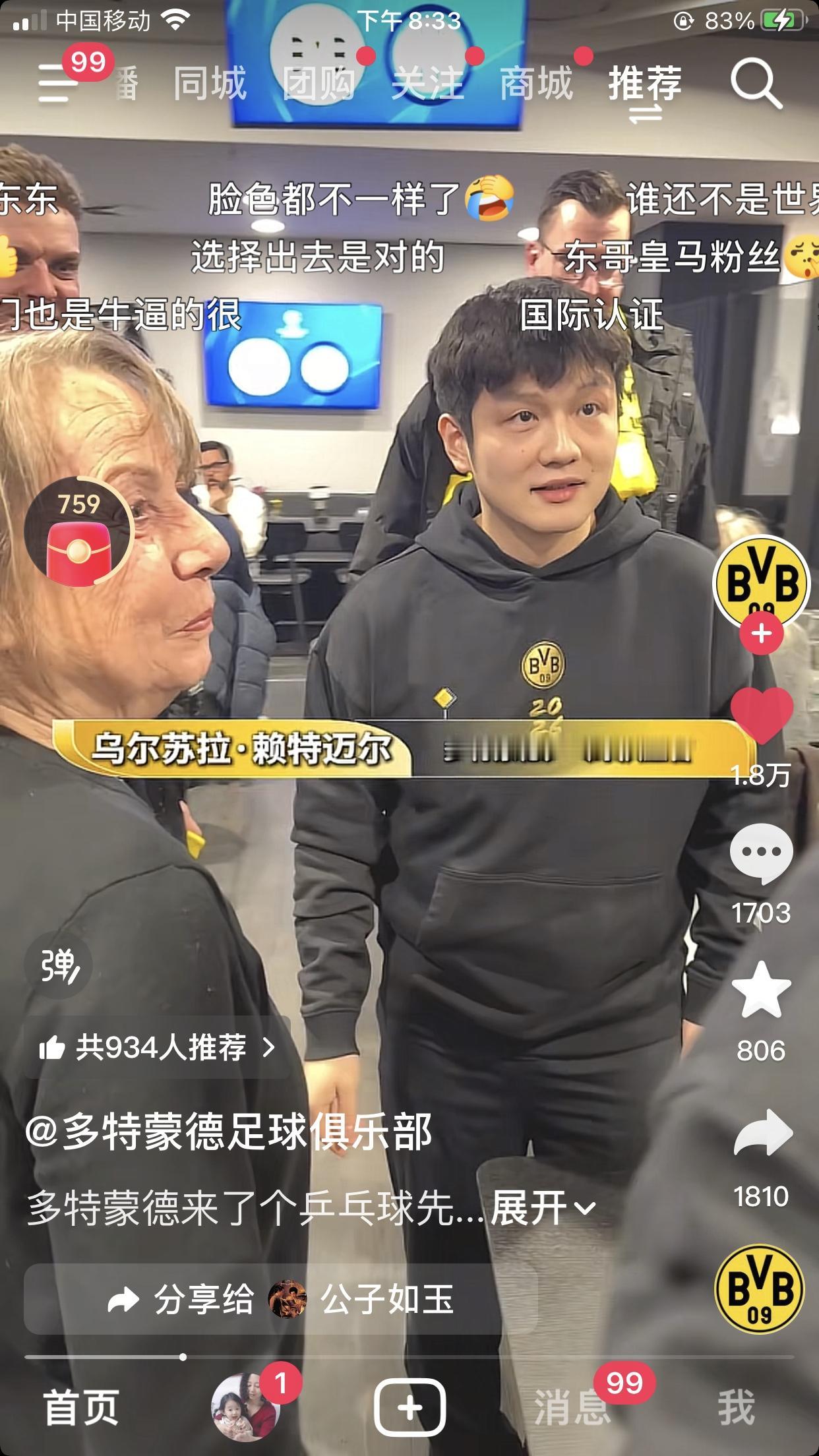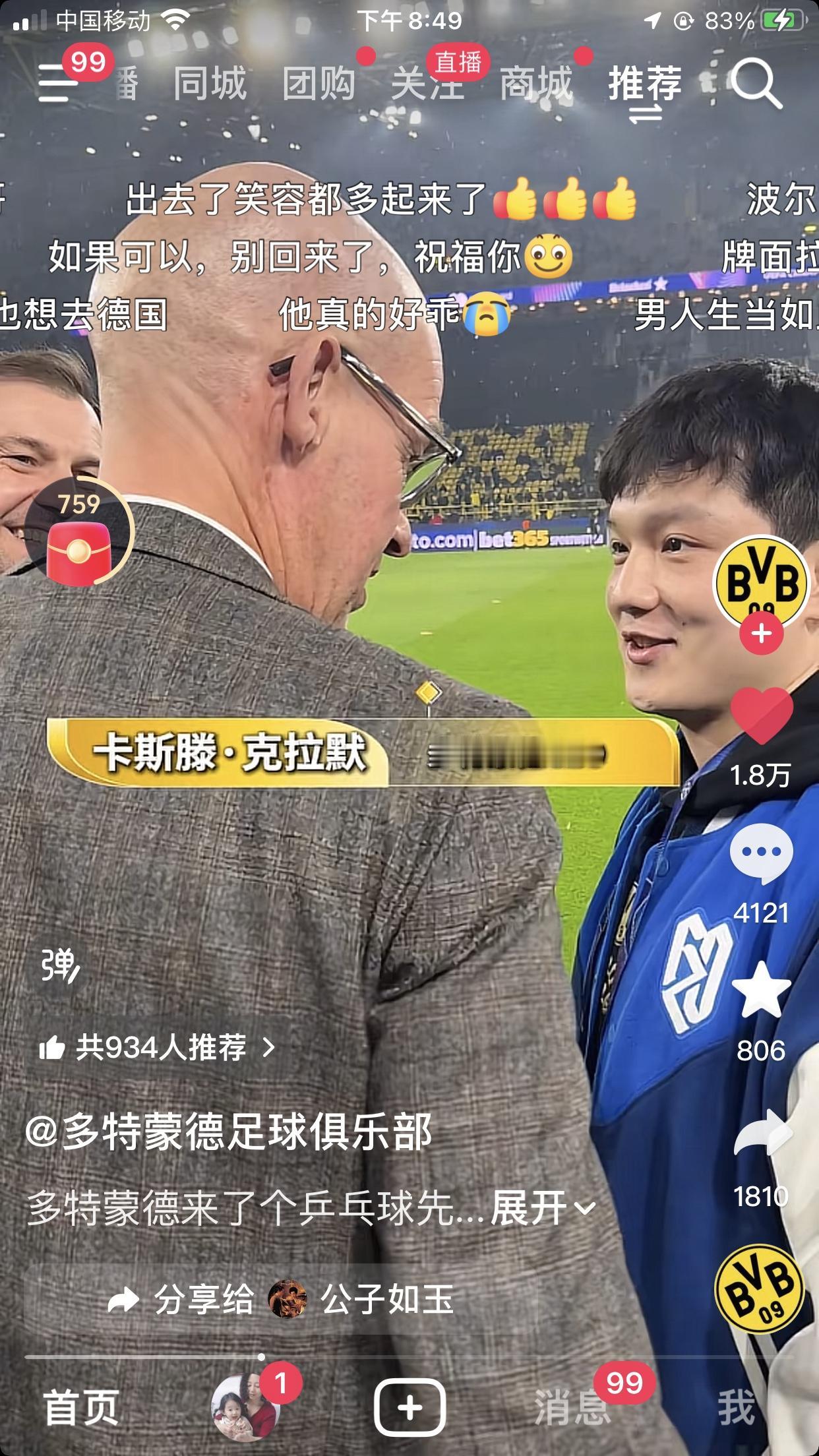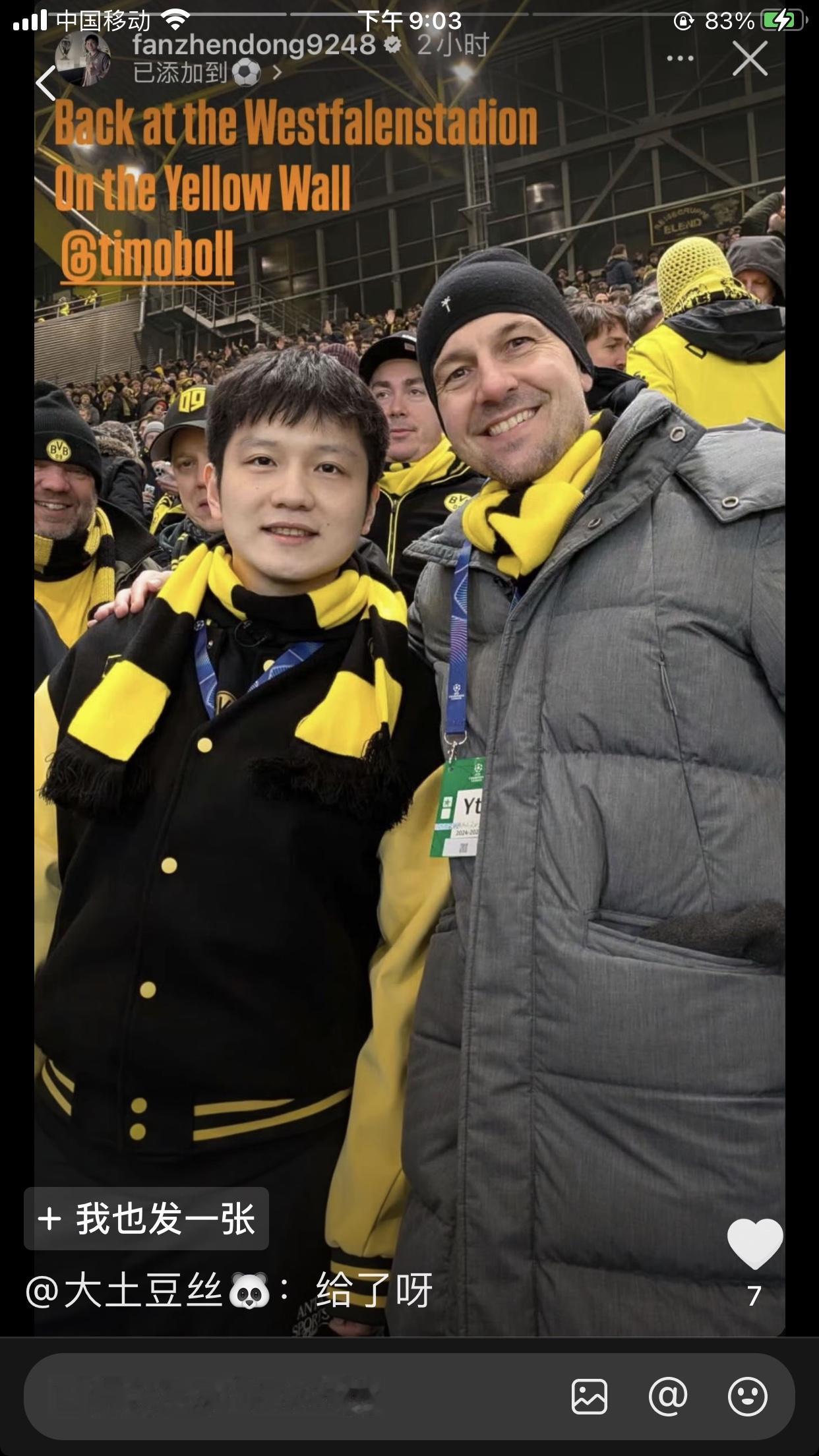德甲多特蒙德俱乐部现在就开始抢人了。樊振东现身多特蒙德足球主场观看足球比赛。俱乐部CEO与乒乓球先生进行了世纪会面。觉得压力给到了萨尔布吕肯,看到多特蒙德要抢人会不会紧张。 这位CEO对东哥说:如果你为多特蒙德打球,下个赛季揭幕战,我们就在球场打乒乓球,观众看起来可能会吃力,但你有8万人围观。 刷到这个视频,心情直接亮了一个度!东哥在足球场上的样子特别放松,多特蒙德的招待也太有心了。看着他们笑着交流的画面,会觉得体育不只是竞技,更是一群热爱生活的人在传递快乐。这种跨界的温暖,必须让更多人看到!
