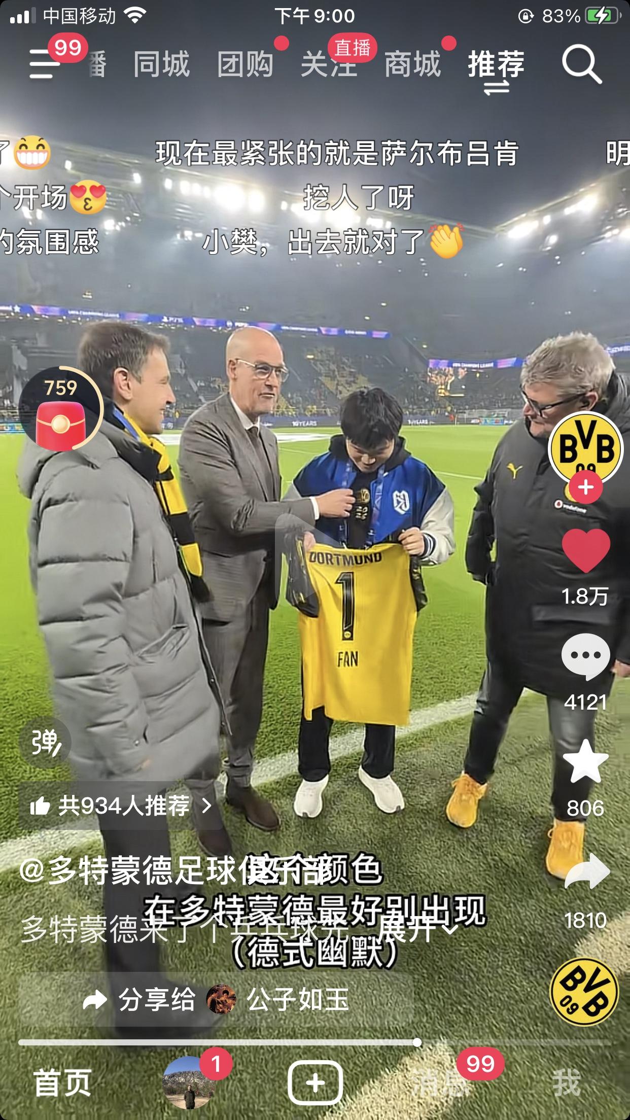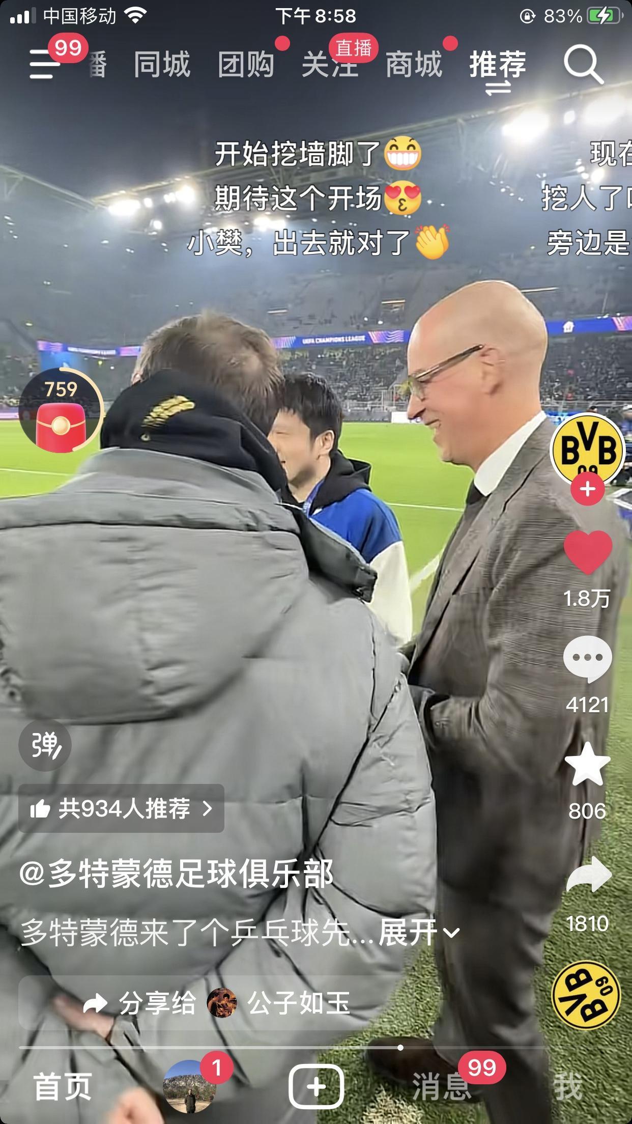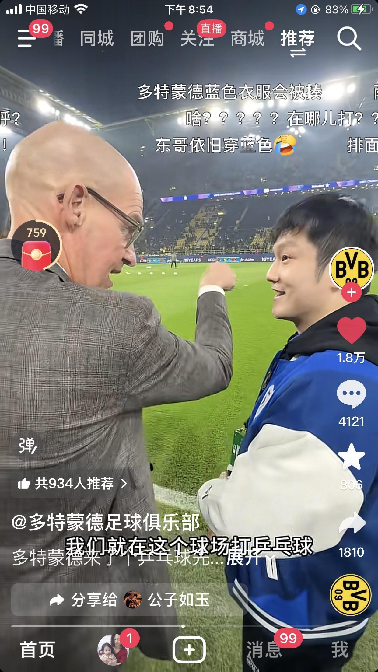 德甲多特蒙德俱乐部现在就开始抢人了。樊振东现身多特蒙德足球主场观看足球比赛。俱乐部CEO与乒乓球先生进行了世纪会面。觉得压力给到了萨尔布吕肯,看到多特蒙德要抢人会不会紧张。 这位CEO对东哥说:如果你为多特蒙德打球,下个赛季揭幕战,我们就在球场打乒乓球,观众看起来可能会吃力,但你有8万人围观。 刷到这个视频,心情直接亮了一个度!东哥在足球场上的样子特别放松,多特蒙德的招待也太有心了。看着他们笑着交流的画面,会觉得体育不只是竞技,更是一群热爱生活的人在传递快乐。这种跨界的温暖,必须让更多人看到!