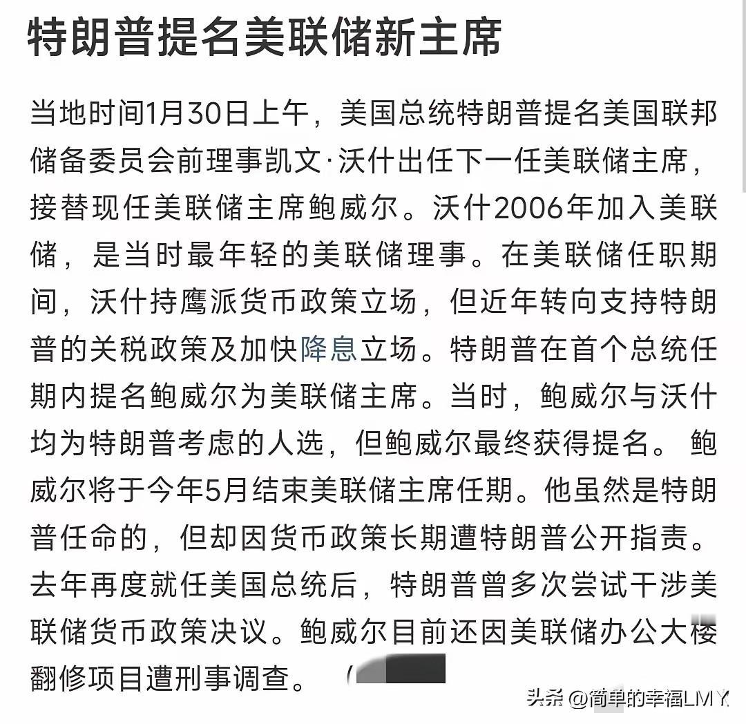 特朗普这是一个跟头要栽两次啊! 当地时间1月30日,特朗普提名沃什为下一任的美联储主席,基本上已经确定了美联储主席的人选。 要说这沃什,以前跟特朗普的经济主张压根不是一路人,可最近却跟他越走越近。 这人是出了名的“鹰派”,向来不主张降息,最近几次降息投票,他都投了反对票。 有意思的是,真成了美联储主席人选,他的观点居然跟鲍威尔几乎一个模子。 上一任美联储主席就是特朗普选的,可他对鲍威尔没少发火,就因为降息降得太慢,上回就栽在这上面。 沃什要是真当选,大概率还会延续慢悠悠的降息节奏。特朗普盼着的快速降息,怕是难成。 这几天股市跌得厉害,跟这事儿脱不了干系。沃什这风格,会让经济刺激的步子拖得更慢,全球资本市场都跟着遭殃。 老话说“一朝被蛇咬,十年怕井绳”,特朗普怎么就不长记性?上回选鲍威尔,原以为能按自己的意思来。 结果人家按经济规律办事,降息慢了点,他就急得跳脚。这次选沃什,看着是跟自己走近了,可骨子里的“鹰派”性子哪那么好改? 美联储主席这位置,不是总统的应声虫。人家得看经济数据说话,通胀怎么样,就业稳不稳,这些才是降息的依据。 特朗普一门心思盼着快速降息,无非是想给经济加把火,捞点政治资本。可经济这东西,像块豆腐,急了容易碎。 沃什的反对降息,不是跟谁过不去。鹰派的思路里,稳比快重要。贸然降息,万一通胀抬头,那麻烦就大了。 就像开车,踩油门容易,可要是路面滑,猛踩只会出事故。股市最怕的就是不确定性,更怕政策跟预期拧着来。 特朗普想靠降息刺激市场,沃什偏要慢慢来,投资者心里没底,自然就用脚投票,股市不跌才怪。 全球资本市场连着筋,美国这边一动,别处跟着晃,这就是连锁反应。有人说,特朗普这是给自己找不痛快。 选来选去,选了个跟前任路子差不多的人,之前的火算是白发了。可换个角度想,他或许也是没办法。 美联储主席得有点独立性,太听话的人,市场不认可,国会那边也通不过。沃什就算是鹰派,至少现在跟他走得近,总比选个对着干的强。 可经济规律不看人情,该慢的时候快不了,该稳的时候急不得。鲍威尔当年降息慢,是因为经济没到非降不可的地步。 沃什要是延续这风格,说明他认的是经济规律,不是谁的面子。特朗普栽过一次跟头,该明白强扭的瓜不甜。 美联储不是他手里的开关,想怎么拧就怎么拧。这次要是还逼着沃什快降息,怕是又要自讨没趣。 股市跌了,投资者慌了,这些都是暂时的。可要是政策真被政治绑架,乱了节奏,那才是真的麻烦。经济这盘棋,得慢慢下,一步错,步步错。 沃什还没正式上任,可市场已经用跌势给他提了醒。也给特朗普提了醒:经济不是儿戏,选对人重要,尊重规律更重要。 再栽一次跟头,怕是想爬都难了。说到底,降息快慢,得看经济脸色。特朗普再急,也拗不过市场规律。 沃什这颗子落下,棋局怎么走,还得看往后的经济数据说话。急也没用,不如等着瞧。