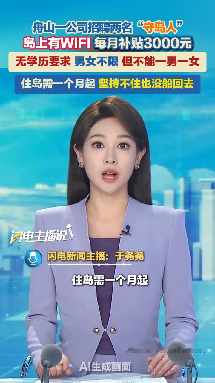 舟山一公司招聘两名"守岛人",岛上有WIFI每月补贴3000元,无学历要求男女不限但不能一男一女,住岛需一个月起坚持不住也没船回去。 闪电新闻主播于尧尧。 舟山一公司招聘两名"守岛人",岛上有WIFI每月补贴3000元,无学历要求。公开报道显示,招聘守岛人的是一家养殖公司,工作人员称该岗位主要负责岛上设备维护、定时喂料和日常巡查。 此次招聘的两名"守岛人"虽说男女不限,但不能是一男一女。另外岛上有Wi-Fi,日常打电话、玩手机都没问题,不过没有空调,日常饮用水和物资也需要靠船一周配送一次。此外住岛需一个月起,待一两天坚持不住也没船回去。 上述招聘计划发布后意外爆火,短短几天咨询电话被"打爆"。