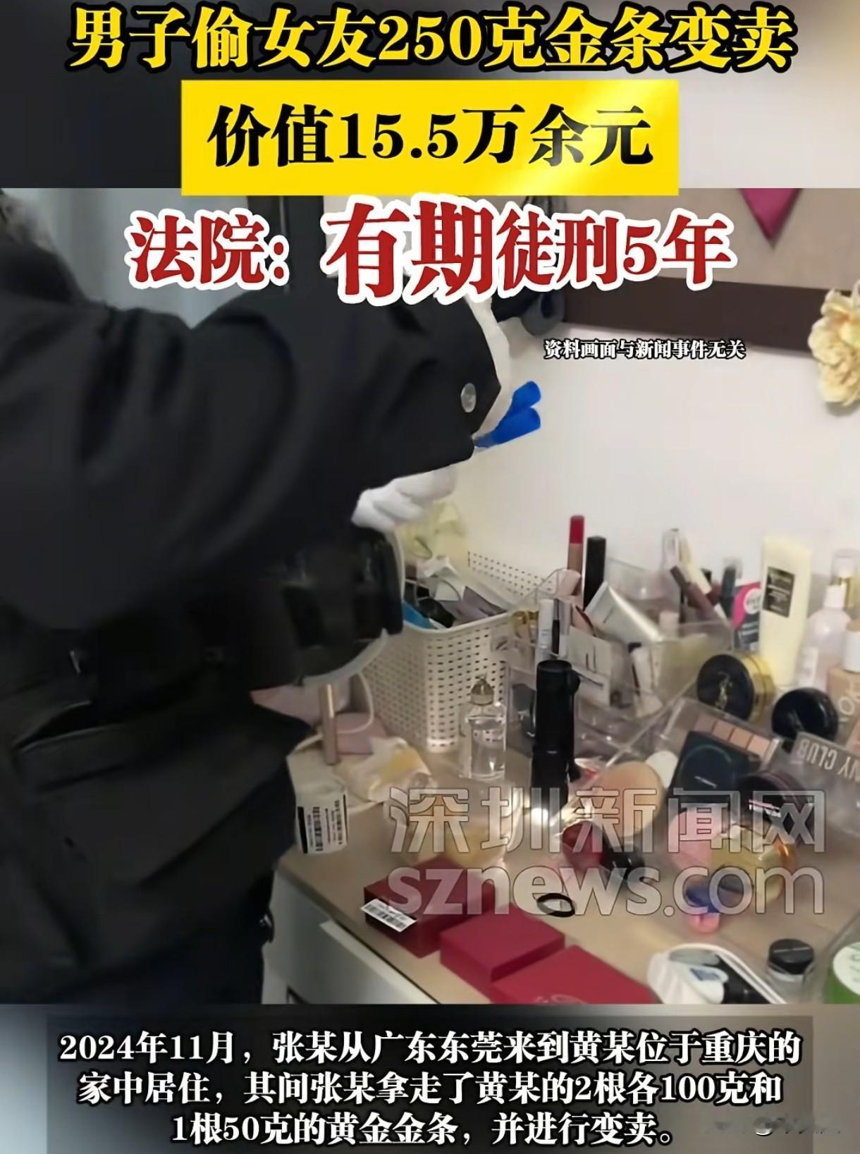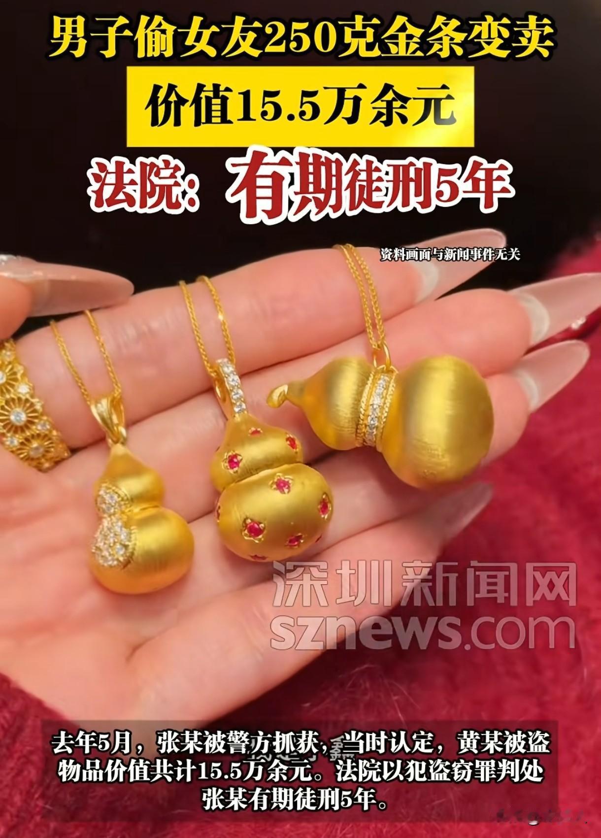 广东一男子,去重庆女友家居住,离开女友家时,偷走女友250克黄金金条,卖了155000余元。5个月后,男子被抓,因盗窃罪被判处有期徒刑5年,可男子不服,说没有证据证明他偷了,可结果还是悲剧了。网友:卖亏了,留到现在要翻倍! 男子张某与黄女士在网上相识,两人加了好友后,越聊越投机,很快就确定了恋爱关系。 可张某在广东东莞工作生活,黄女士在重庆,两人两地分居,甚是想念。 2024年11月,张某从东莞千里迢迢来到重庆,住进了女友黄女士家里,刚开始,两人相处愉快,日子过得也算甜蜜幸福。 一次偶然的机会,张某在女友家的饭厅上方的吊顶卡槽里,竟然发现里面藏着几根金条,他心生贪念,想着怎么在女友不知道的情况下,偷偷地把这些金条拿走。 当月,张某趁黄女士不注意,把黄女士家中3根金条偷走,其中一根金条是50克,另外2根都是100克的。 之后,他找借口离开了黄女士家,迫不及待的去了金店,把那根50克的金条换了一根37克的黄金项链,店家还补了7005元给他。 2024年12月3日,他又把另外2根各100克的黄金金条卖掉,一共卖了121000余元。 之后好几个月过去,黄女士都没有发现异常,张某也以为事情已经过去了。 2025年4月,张某发现自己家的黄金金条不见了,报了警,警方顺藤摸瓜,抓到了张某。 经过调查,张某窃取他人财物总价值高达15万余元,其行为已经构成了盗窃罪。 《刑法》第264条的规定:盗窃公私财物,数额巨大或者有其他严重情节的,处三年以上十年以下有期徒刑,并处罚金。 一审法院判决张某犯盗窃罪,判处其有期徒刑5年。 对于这个判决结果,张某不服,提起了上诉,他认为事情都过去这么久了,现在没有证据能够证明他实施了盗窃行为,因此不构成盗窃罪。 可雁过留痕,张某当初去出售这些金条时,在金店里登记了身份信息、联系方式和金条编号等,工作人员提供的黄金回收单上,金条的编号与黄女士提供购买金条的编号完全一致,这就充分证明了张某所卖的金条就是黄女士的,张某的盗窃行为证据确凿。 二审法院驳回了张某的上诉,维持了原判。 张某最终为自己的行为买单,获刑5年。 有人调侃:张某损失惨重,如果这250克黄金放到现在来卖,价格上要翻一倍。 张某和黄女士从网络相识到现实恋爱,本是一段美好缘分的开始,却因为张某的贪婪和不当行为,演变成了一场闹剧。 张某在与黄女士确立恋爱关系并入住黄家中后,本应珍惜这份感情,相互信任、相互扶持。 可当他发现黄女士藏在吊顶卡槽内的金条后,顿生贪念,悄悄将金条盗走,被抓后,试图狡辩,说没有证据能证明金条就是他偷的。 张某不仅触犯了刑法,也违背了公序良俗,说明他人品不行,黄女士也算及时止损了。 黄女士将价值不菲的金条放在餐厅吊顶的卡槽里,以为这是一个藏东西的好地方,却不想自己引狼入室,让张某有了可乘之机。 这也提醒我们,在日常生活中,要重视对贵重物品的保管,提高安全意识,避免因疏忽大意而造成不必要的损失。 同时,在恋爱过程中,要充分去了解对方的为人和品德,在没有深入了解对方的情况下,不要随意把他人带回自己家中,以免识人不清,给自己带来伤害。