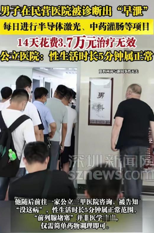 被坑惨了!1月28日报道,山东青岛,38岁男子正值壮年,但夫妻生活时间太短,让他非常困扰。情急之下,他在网上找了家私立医院去看,每天都进行半导体激光和中药灌肠等项目,14天就花了3.7万余元,但一点效果都没有。费用太贵,男子负担不起,又找了家公立三甲医院,谁知医生表示:你根本没病,性生活5分钟就属于正常。男子一听这话,感觉自己被坑惨了,马上将私立医院投诉。 青岛有个38岁的孙先生,这岁数正当年,家里有老婆孩子,日子过得挺踏实,但他心里一直有个解不开的疙瘩,那就是夫妻生活这事,每次也就五六分钟,他总觉得自己有点“不行”,怕老婆不满意,更怕这事传出去让人笑话,越想这事心里越没底,越焦虑,就老琢磨着找个地给好好治治。 孙先生这人脸皮薄,觉得这男科问题属于难言之隐,去公立三甲医院挂号排队啥的太尴尬,万一碰上熟人那脸就丢大了,而且医生要是当着好多人面问得细了,他也张不开嘴。 这一急,他就上网搜男科医院,结果一下子就蹦出来个医院的广告,那广告吹得那是天花乱坠,说什么专门治男性那方面的问题,见效特别快,还不复发,最关键的是人家是一对一诊疗,绝对保护隐私。 孙先生一看,这不正好符合自己心意嘛,想着私立专科医院服务好又专业,他就火急火燎地找过去了。 一进那医院大门,医生二话不说先开了一堆单子让他做检查,没过多久,医生拿着检查单子一脸严肃地进来了,跟他说:“你这问题可严重了,不光是早泄,前列腺都给堵了,必须得赶紧治,要不以后这毛病更麻烦。” 孙先生一听这话,魂都快吓飞了,赶紧问医生咋治,医生大手一挥,当天就给他安排了三针降敏针,一针就要1800块钱,还做了个所谓的腺体疏通,光这一天,这就花了7000多。 医生还没完,千叮咛万嘱咐说这病得连着治才有效,让他第二天必须再来,孙先生心想,这钱都花了,不能半途而废啊,只能硬着头皮接着去。 接下来的半个月,他天天都得往医院跑,今天做个半导体激光,明天做个腔道介入,后天再来个中药灌肠,这一套下来,每天光治疗费就得干出去一千七八。 孙先生心里就盼着这钱花到位了病能好,可连着治了14天,一共砸进去3万7千多块钱,他感觉自己一点起色都没有,反而因为天天跑医院、看着钱跟流水似的往外花,心里更焦虑了。 这3万7可是他大半年的积蓄啊,实在扛不住了,没办法只能停了。 后来实在没辙,孙先生只能硬着头皮去了当地一家正规的公立三甲医院,想让那边的专家给看看。 结果那医生听完他的情况,又简单检查了一下,直接给他来了句:“你这身体好着呢,根本没病啊!” 医生给他科普说,医学上早泄的标准是那啥以后不到一分钟就完事,孙先生这五六分钟完全是正常范围。 至于那个什么“前列腺堵塞”,根本就不是正经的医学名词,纯属瞎扯淡,顶多算有点轻微炎症,吃点普通的消炎药调理一下就行,完全用不着做那些乱七八糟还死贵的仪器治疗。 孙先生一听这话,当时就傻眼了,紧接着就是又气又后悔,感觉自己像是掉进了无底洞,被这家私立医院坑惨了。 他仔细回想了一下,在之前那家医院治了半个月,医院连个正规的诊断证明都没给过他,完整的检查报告也没见过,每天除了催他交钱就是让他做治疗。 气不过的孙先生立马找相关部门投诉,可调解了几次,因为两边要价差距太大,根本谈不拢,后来有记者联系到医院,那边的说法倒是挺理直气壮,说诊疗过程全合规,收费也都是明码标价。 对于那个“前列腺堵塞”的说法,他们解释说是医生为了让病人好理解打的比方,其实就是前列腺炎。 而且他们说孙先生病历上写的是2分钟,虽然严格来说不算早泄,但他自己有调理的意愿,医院才给治的。 现在孙先生是进退两难,那3万7的冤枉钱想要回来难如登天,这病本来也没治的必要,他现在正琢磨着找律师打官司维权。 这事也给广大男同胞提了个醒,碰上这种难言之隐,千万别信网上那些私立医院的广告,那些听着高大上的“高科技疗法”大多是忽悠人的噱头,不仅花了冤枉钱没效果,还可能把身体给治坏了。 真有问题,还得去正规的公立三甲医院,那里医生专业、收费透明,既靠谱又不会让你当冤大头,别像孙先生这样,本来没病,硬是被忽悠着花了大价钱买罪受,最后后悔都来不及。 对此你怎么看? 信源:深圳新闻网