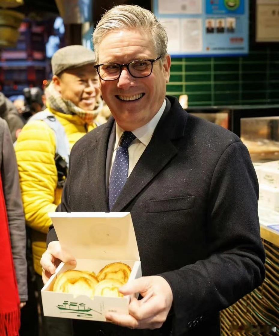 英相斯塔默在上海游玩,品尝蝴蝶酥。