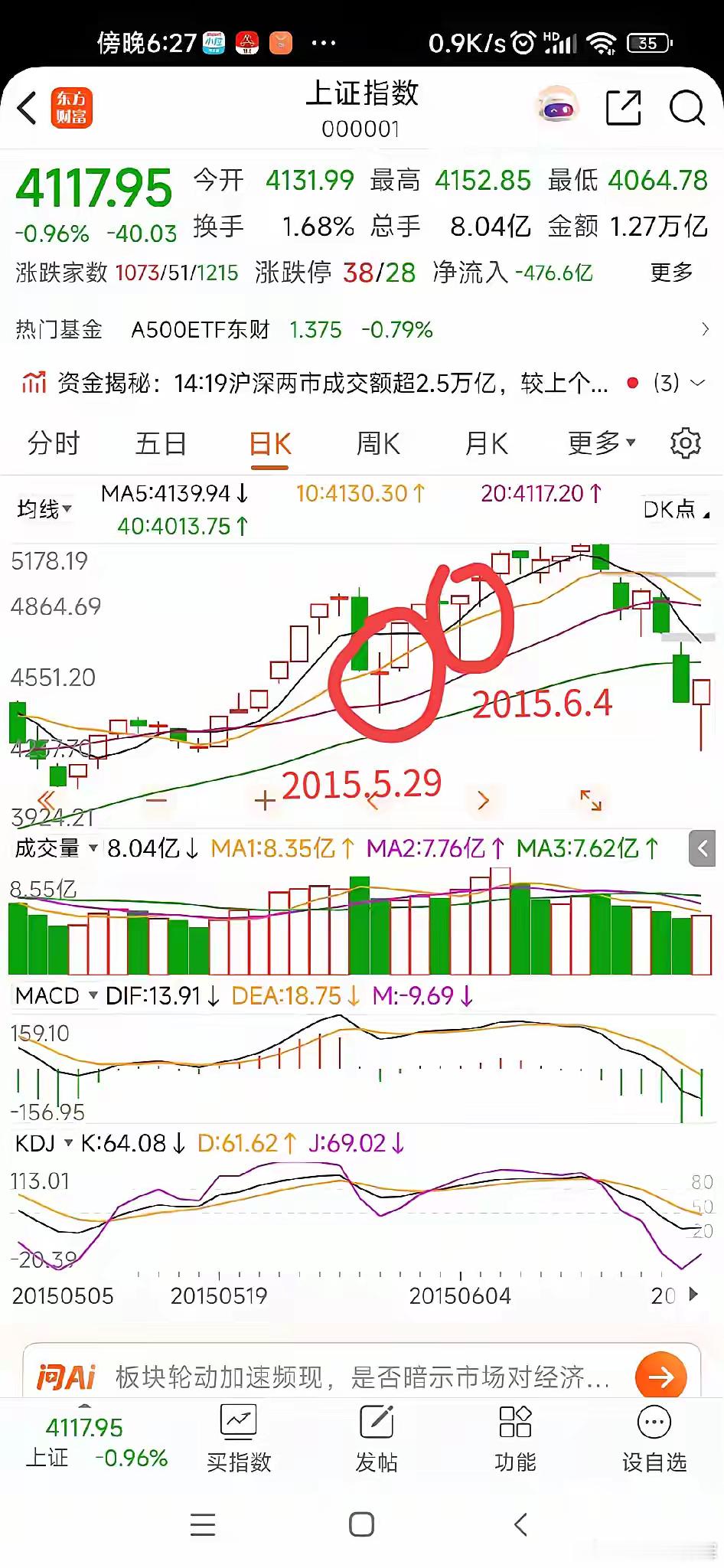 今天大A惊魂一刻,日内90点的巨大振幅,与2015年的超级大牛市完美契合。历史会重演么?2015.5.29上证出现单日260点的振幅;2015.6.4上证出现单日300点振幅;完美的大长腿,每次都收回来。接下来到2015.6.12走出5178.19点,也就是那次牛市的最高点的7个交易日,走势稳健,没有放量,没有上冲,2015.6.13日直接开始了几年的下跌。直至现在。是不是也可以把下次出现的日内百点振幅理解为:减仓信号,这是主力资金用行动表明意见分歧,他们的观点再次统一时就是真正下跌的开始。