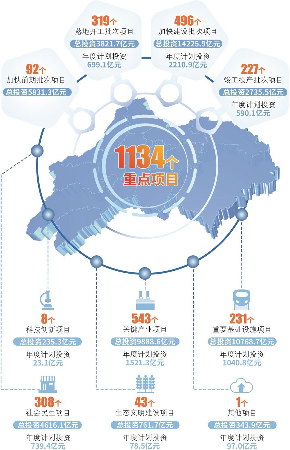 其中——加快前期批次项目92个,总投资5831.3亿元;落地开工批次项目319个,总投资3821.7亿元,年度计划投资699.1亿元;加快建设批次项目496个,总投资14225.9亿元,年度计划投资2210.9亿元;竣工投产批次项目227个,总投资2735.5亿元,年度计划投资590.1亿元。