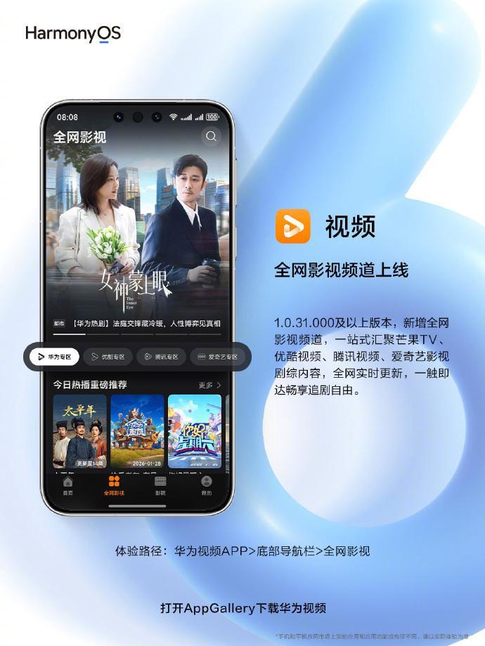 华为视频新增「全网影视」频道,一站式汇聚芒果TV、优酷视频、腾讯视频、爱奇艺影剧综内容,全网实时更新,精彩一触即达,畅享追剧自由!