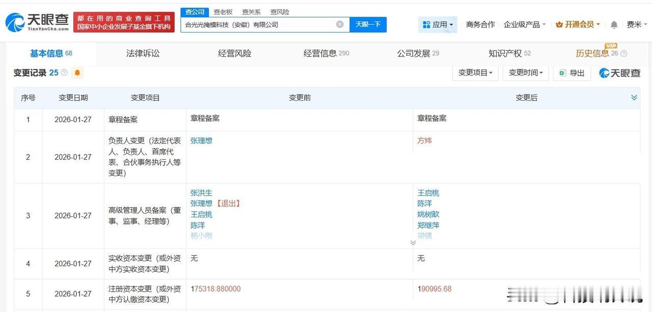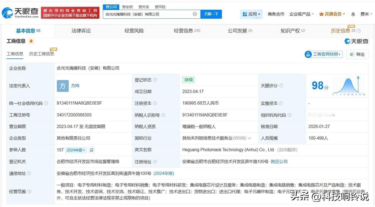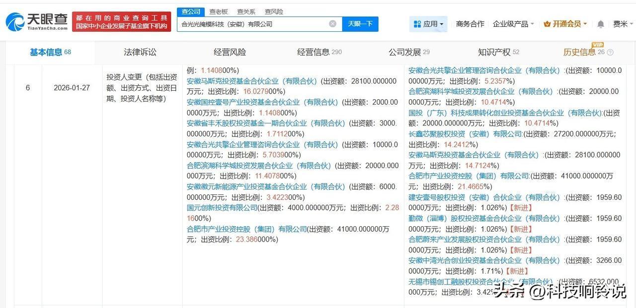 【蔚来资本等入股合光光掩模科技公司】 天眼查App显示,近日,合光光掩模科技(安徽)有限公司发生工商变更,新增勤微(淄博)股权投资基金合伙企业(有限合伙)、蔚来资本旗下合肥蔚来产业发展股权投资合伙企业(有限合伙)等为股东,张理想卸任法定代表人,由方炜接任,同时,注册资本由约17.5亿人民币增至约19.1亿人民币。 该公司成立于2023年4月,经营范围包括电子专用材料制造、电子专用材料销售、电子专用材料研发等,现由合肥市产业投资控股(集团)有限公司、安徽马斯克投资基金合伙企业(有限合伙)及上述新增股东等共同持股。官网显示,该公司主要从事掩模板的研发、设计、生产和销售业务。 天眼查信息:
