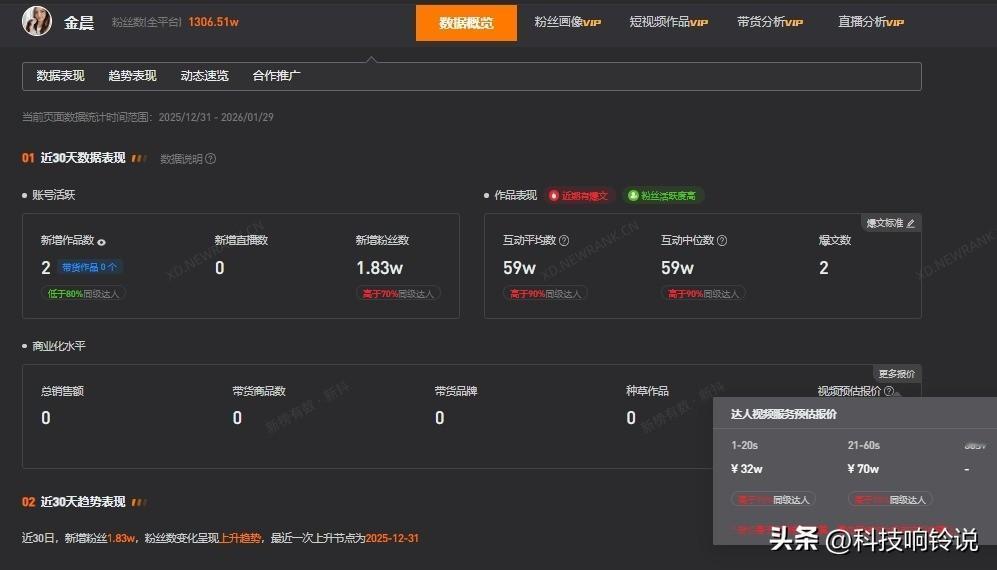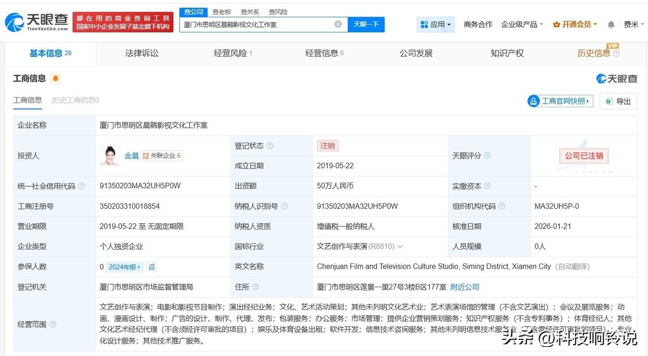 【金晨今年已注销名下一工作室 金晨商业版图盘点 金晨现有粉丝1306万】警方通报金晨事件 据媒体报道,1月30日,绍兴市公安局柯桥区分局发布警情通报,此前,“金晨被曝疑似涉嫌交通肇事逃逸”事件引发各界关注。 天眼查App显示,金晨名下关联6家企业,其中3家为存续状态,包括上海芊桐影视有限公司、北京韵梦文化传媒有限公司等。值得一提的是,此前,金晨名下厦门市思明区晨鹃影视文化工作室的登记状态由存续变更为注销。 第三方数据显示,截至1月30日下午5点,金晨现有粉丝1306.8万,视频平台账号近30日涨粉1.83万。商业化水平显示,其1-20s、21-60s视频预估报价分别为32万、70万。 天眼查信息:-c1654737797