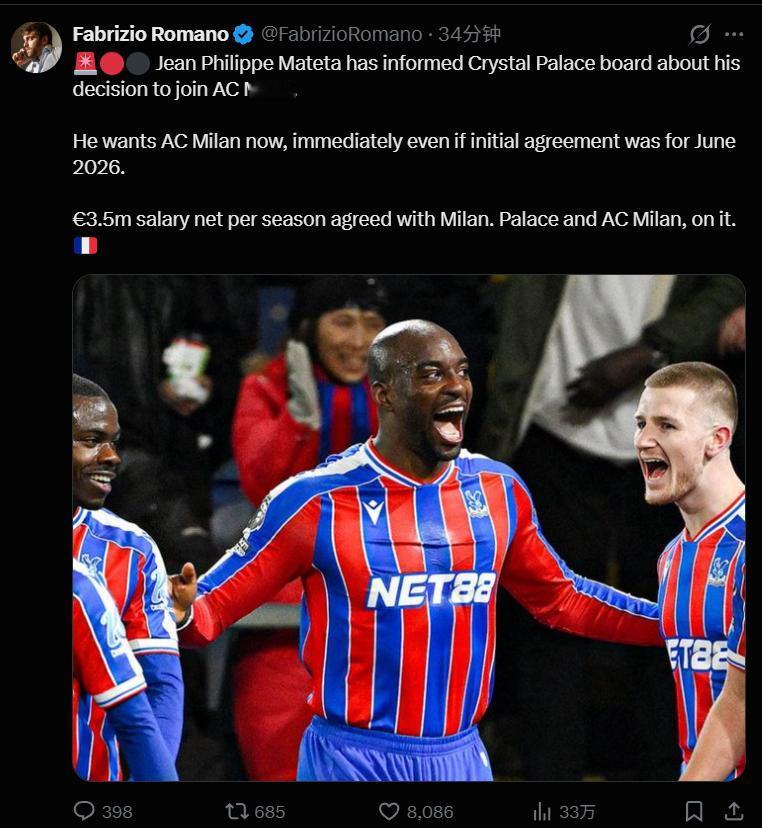 【即将HWG?】 罗马诺: 马特塔已向水晶宫俱乐部董事会告知其加盟 AC 米兰的决定。他希望立即加盟AC 米兰,即便双方最初约定的转会时间为 2026 年 6 月。马特塔与米兰已达成协议,年薪税后 350 万欧元。水晶宫俱乐部与 AC 米兰方面均已确认此事。
