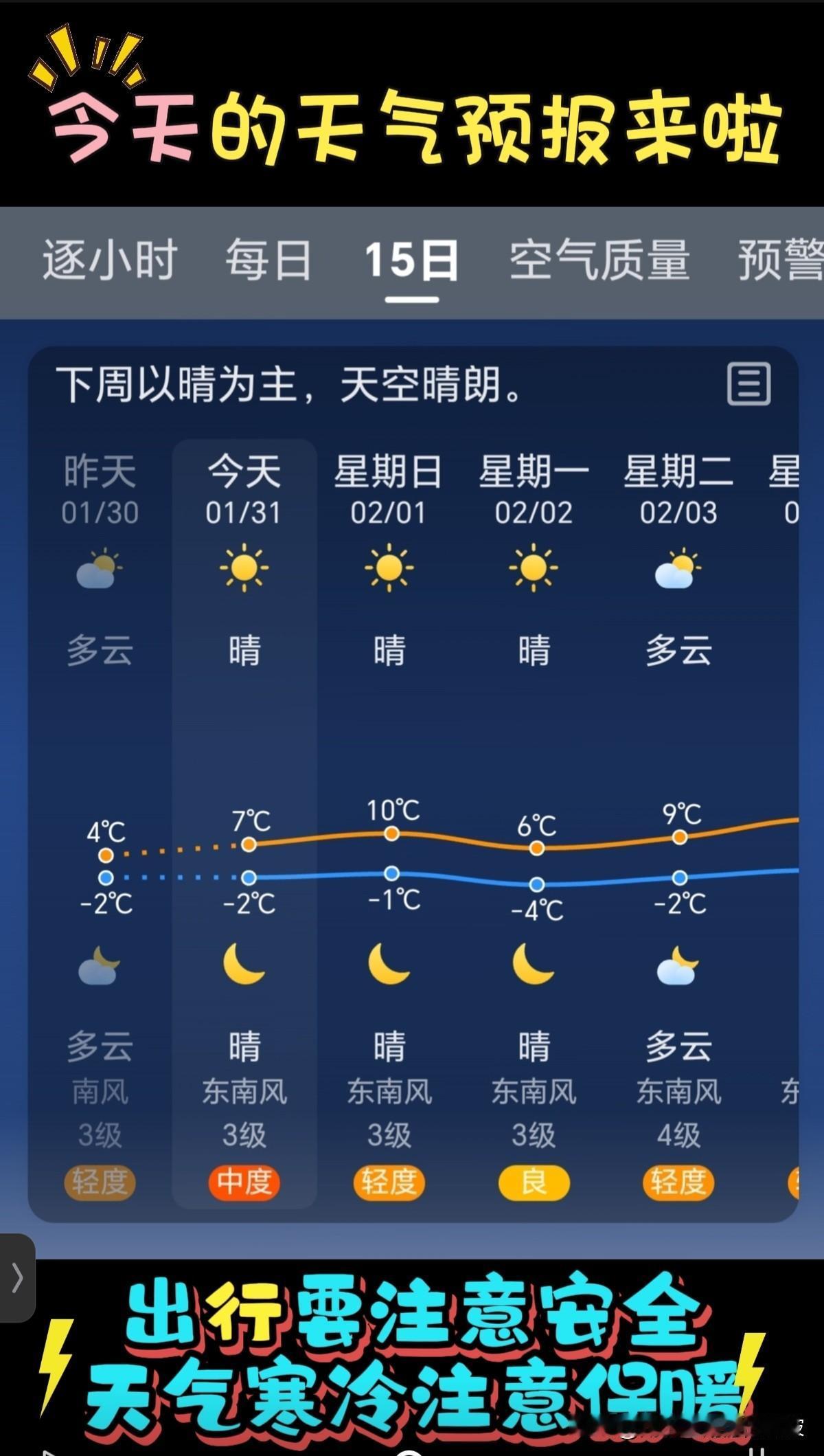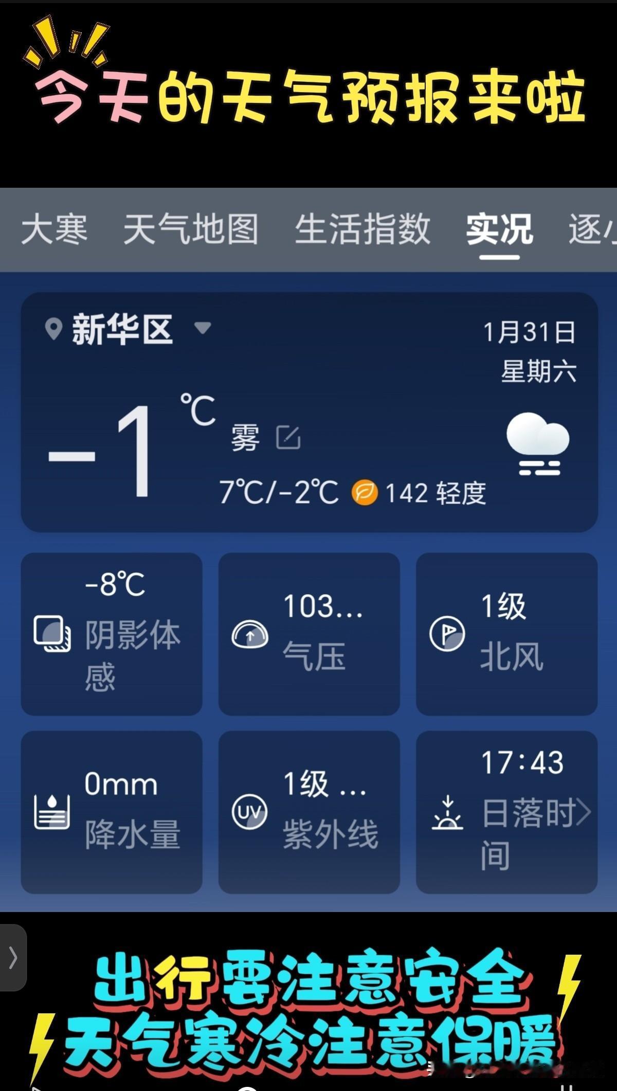 🌻早安问候🌻 𝟎1/31 𝙂𝙤𝙤𝙙 𝙈𝙤𝙧𝙣𝙞𝙣𝙜 今天是: 2026年1月31日 农历:乙巳年腊月十二 星期六 周末到啦!好好犒劳犒劳自己吧! 签到成功,获得31个创业卷,已续签到31天! 今日天气: 多云🌥下周以晴为主,天空晴朗 空气质量: 轻度污染,儿童、老年人及心脏病、呼吸系统疾病患者应尽量减少体力消耗大的户外活动。 气温:多云 7℃~-2℃ 早晚温差11度,湿度大,人体感觉寒冷,极不适应,注意添衣保暖防冻。 湿度:79% 风向:东南风转西北风 风力:3级 紫外线:1级,最弱紫外线辐射天气,无需特别防护。若长期在户外,建议涂擦SPF在8-12之间的防晒护肤品。 日出:7:28 日落:17:43 🌻早上好,祝你周末愉快,心情舒畅,事事顺心,快乐安康🍮🍅