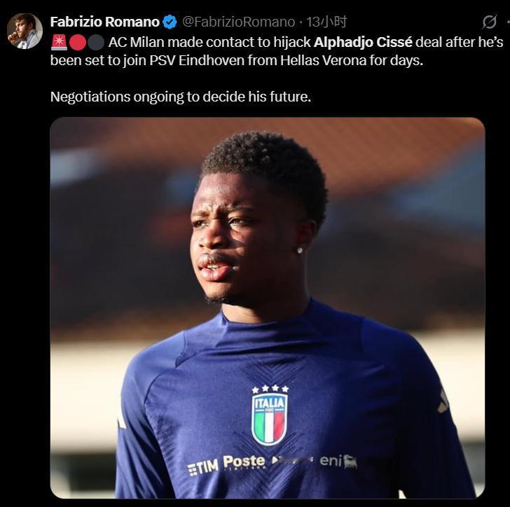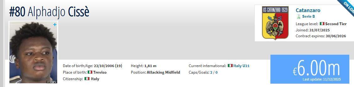 【阿尔法乔·西塞】 大家都在关注马特塔的同时,罗马诺之前还说了一个转会——米兰想要截胡维罗纳转会PSV埃因霍温的——阿尔法乔·西塞,这个应该不是米兰未来的,就是给一线队截胡的, 此人,维罗纳青训,本赛季租借在意乙卡坦扎罗,21场意乙6球1助攻,意乙10月最佳球员,前腰位置,喜欢拉边
