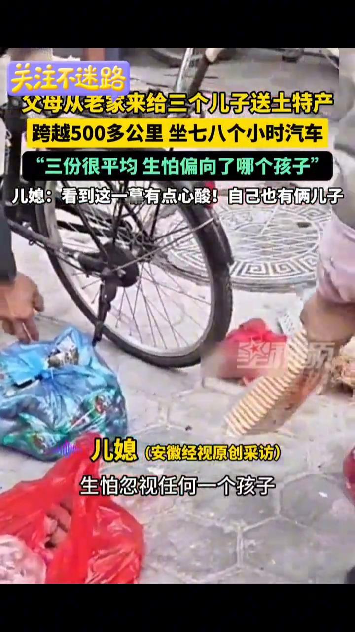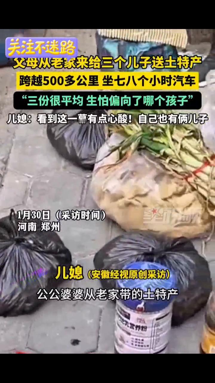 父母从老家来给三个儿子送土特产,跨越500多公里坐七八个小时汽车,"三份很平均生怕偏向了哪个孩子"。儿媳:看到这一幕有点心酸!自己也有俩儿子。 星视频。 1月30日(采访时间),河南郑州。儿媳(安徽经视原创采访):公公婆婆从老家带的土特产平均分成三份,我们弟兄三个。父母考虑得太多了,生怕忽视任何一个孩子,每一份都平均分开。老家离我们有500多公里,他们坐汽车过来要七八个小时,心里就是觉得有点心酸。我也有俩儿子,将来我会不会这样做?
