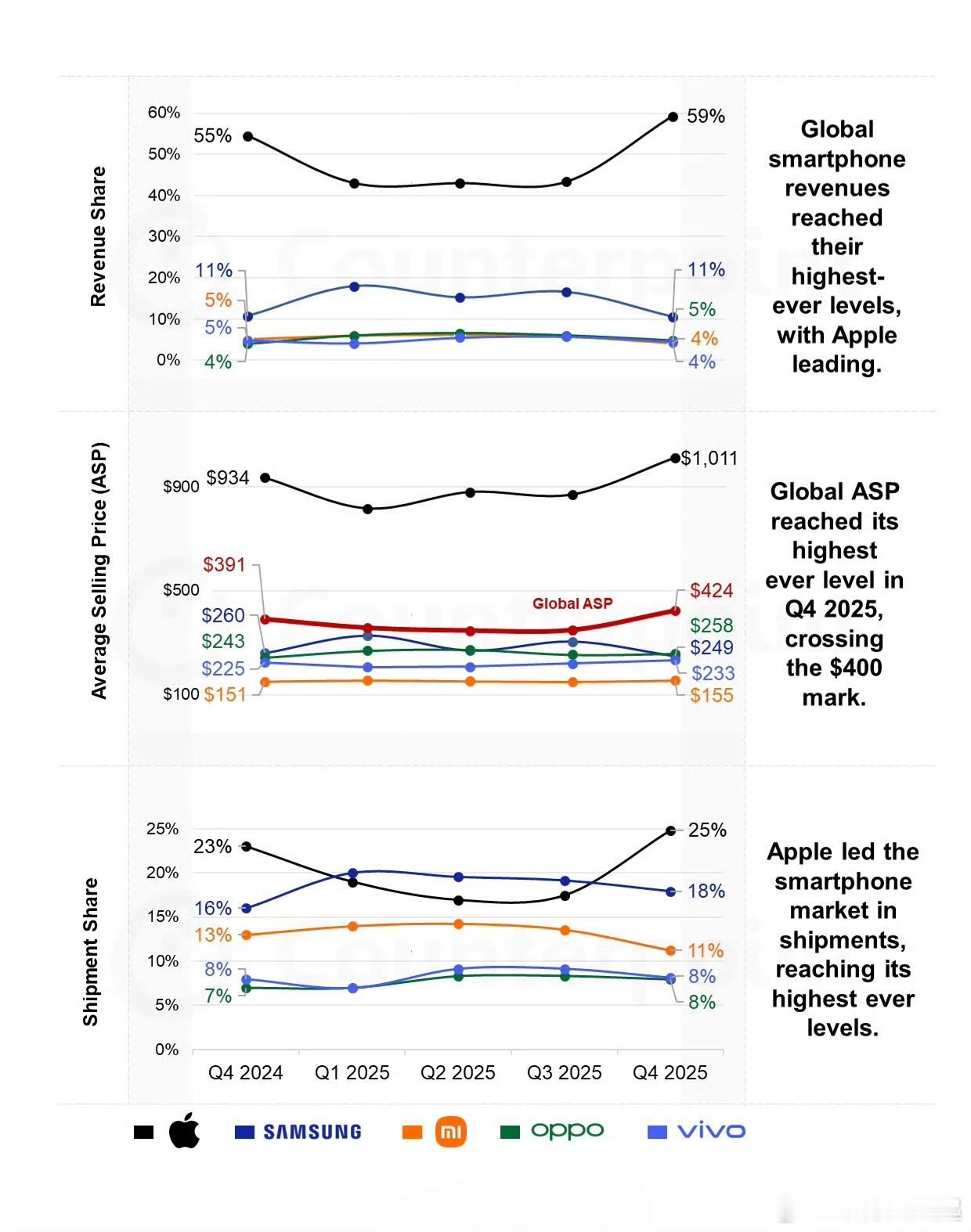 2025年Q4全球销量前五手机品牌平均售价出炉: