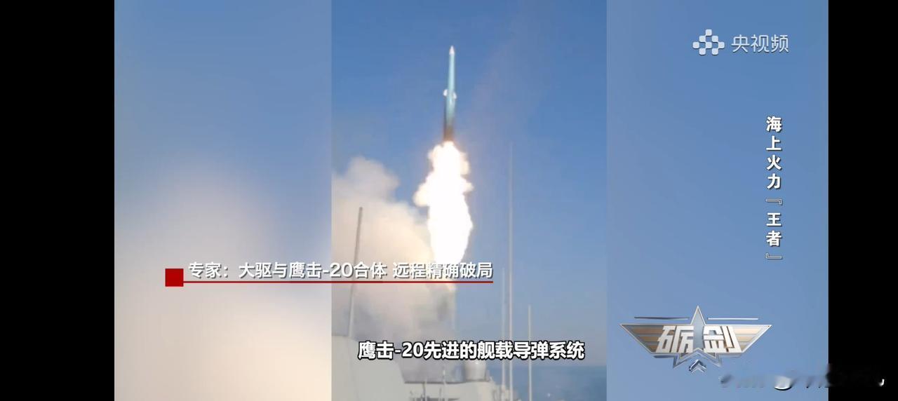 央视再度确认,万吨大驱配备鹰击 - 20新型反舰导弹,发射画面曝光! 近日,《砺剑》节目中,万吨大驱104舰实弹发射鹰击 - 20新型高超声速反舰导弹的画面再度呈现,专家也对此展开分析。万吨大驱与鹰击 - 20的组合,实现了远程精准破局,同时还介绍了鹰击 - 20双椎体设计的优势与特点! 鹰击 - 20反舰导弹的配备,让万吨大驱的实力更上一层楼。这意味着,我方能够打击敌舰,而敌舰的导弹却未必能触及我方,甚至根本够不着。并且,鹰击 - 20的突防速度极为惊人,现有舰艇防御系统很难对其进行拦截,只因它速度太快! 鹰击 - 20相关参数如下: 射程:约1500至2000公里,远超现役的鹰击 - 18反舰导弹(约600公里),大幅拓展了水面舰艇的反舰打击范围。 速度:全程飞行速度超5马赫,属于高超音速武器。有分析认为其末端俯冲攻击速度可达10马赫。 弹道与突防:采用“助推 - 滑翔”机制。双锥体构型弹头可在大气层边缘滑翔、机动,飞行轨迹难以预判,还能以近乎垂直的弹道实施“灌顶”攻击,极大提升了敌方现有防空反导系统的拦截难度。 毁伤能力:较大弹体可携带更重战斗部,凭借极高的末端速度,动能毁伤效果显著,具备单发重创大型舰艇的潜力。 总体而言,鹰击 - 20的核心作战能力体现为远程、高速、突防强、毁伤大的特点。它的列装,标志着中国海军水面舰艇拥有了当前全球顶级的远程反舰打击手段,改变了区域海上的力量平衡,给敌方大型水面编队带来了前所未有的挑战。 大家看法如何?评论区分享你的观点!鹰击导弹