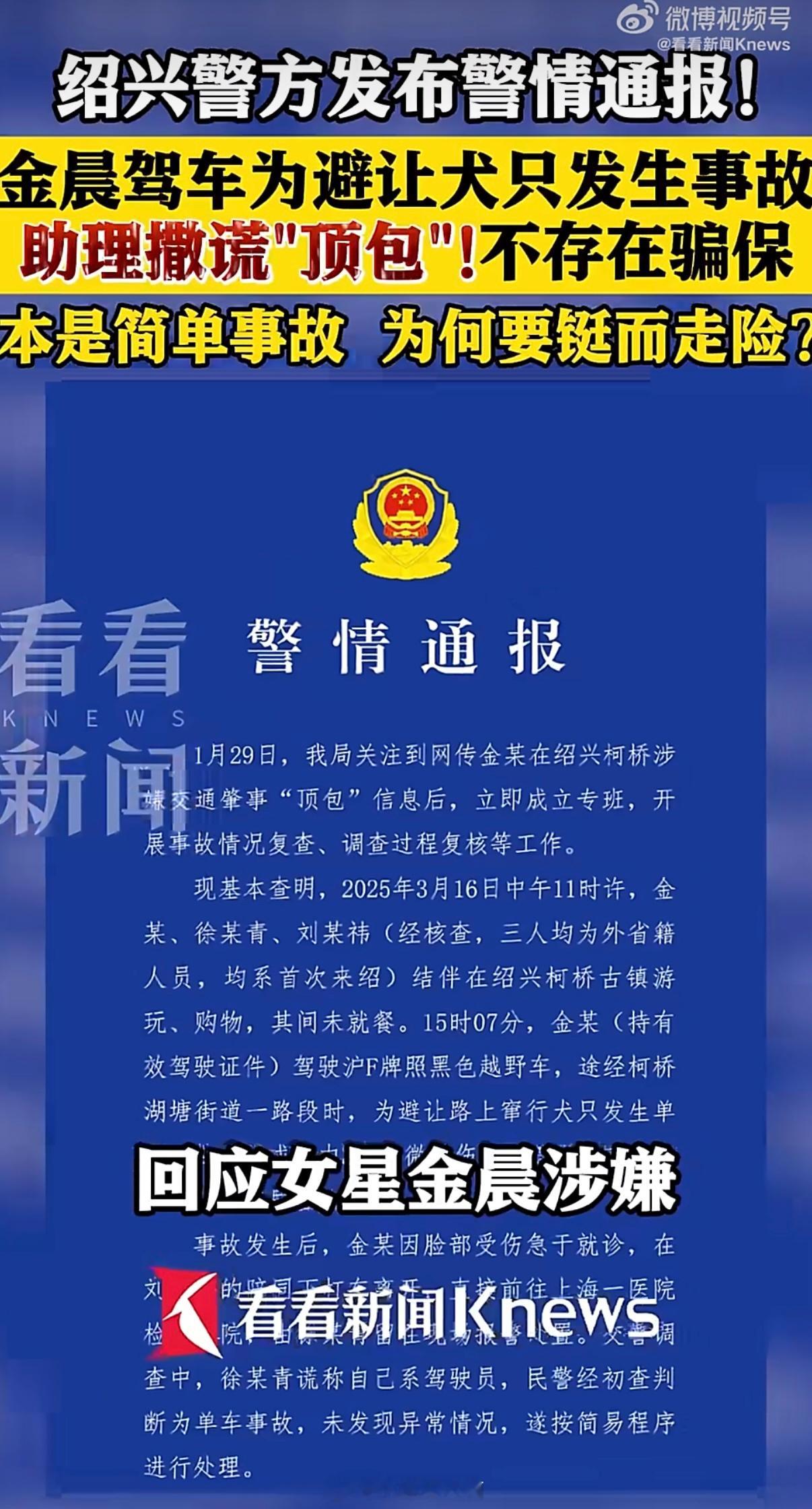 事情是这样的:2025年3月16日,金晨和两个同事(一个经纪人、一个助理)在绍兴玩,开车时突然有只狗冲到路上,她猛打方向盘避让,结果车子撞上了路边的牌子和围墙。三个人都受了点轻伤,车也坏了,还撞坏了一些公共设施。