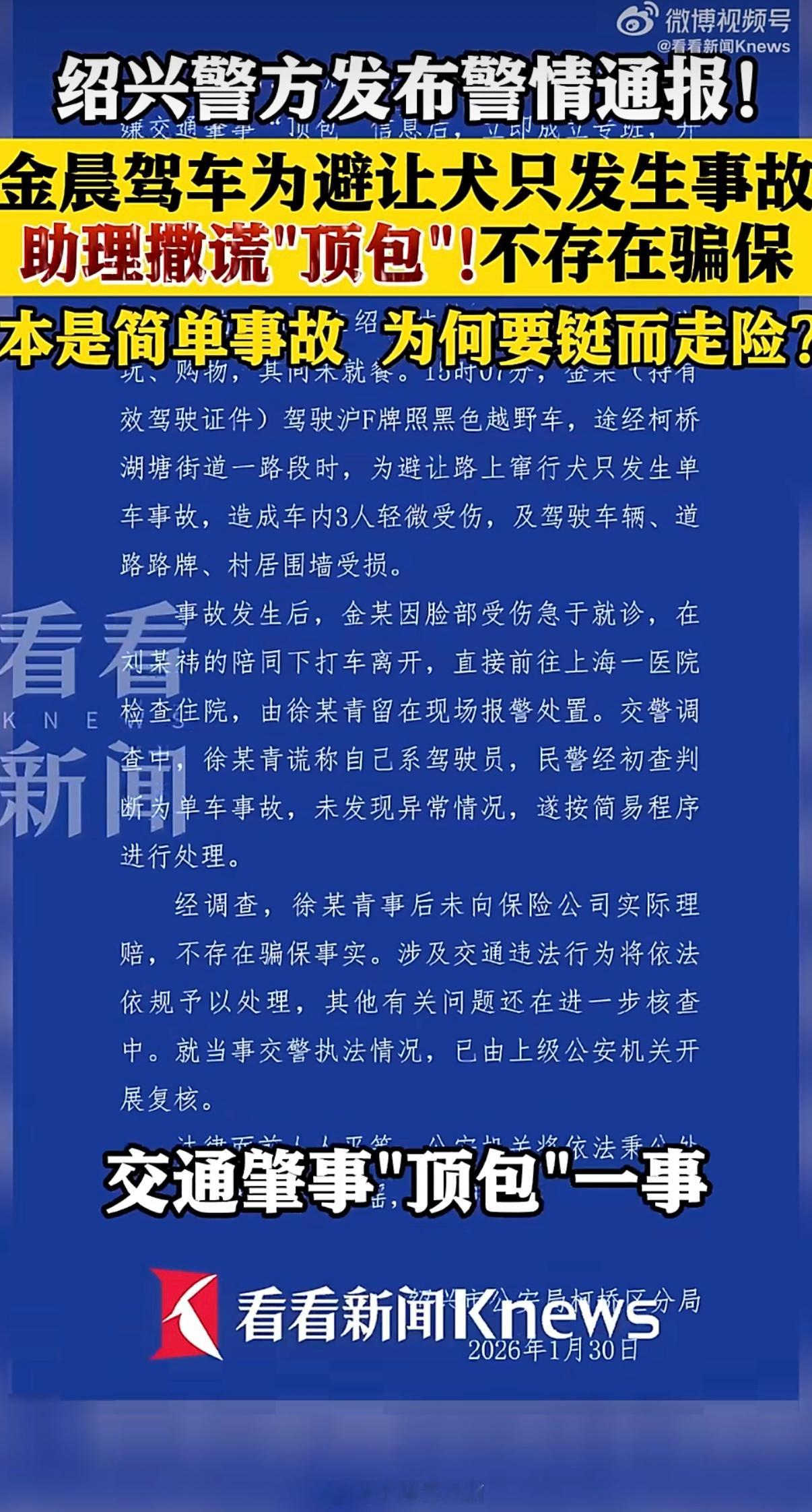 当时因为是单车事故(没撞到别人),现场看起来也没啥异常,交警就按简单流程处理完了。后来查出来,徐某青压根没去保险公司理赔,所以不存在骗保,而且所有损失金晨后来都赔了,一分没少。事情被曝光后,金晨很快发了道歉声明,还贴出了自己当时的伤照,承认自己才是司机,对“顶包”这事表示歉意。