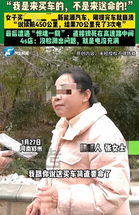“我快吓死了!”河南,女子买了一台新能源汽车,提车当天把电量充到97%后就准备开回老家,说好的续航450公里,结果才跑了70公里就充了3次电,甚至还在高速上趴窝,女子彻底崩溃:“我是来买车的,不是来送命的!” 河南这位张女士决定提辆新能源新车开回老家,订车次日就提车,原是件欢喜事。门店工作人员把车充到97%的电,指着中控屏拍着胸脯说,450公里的续航,跑个短途高速绰绰有余。 张女士记着工作人员教的各种用车注意事项,满心欢喜开着车往家走。可这新车的电,掉得比流水还快。 才开出六十多公里,97%的电量就只剩了25%。不过眨眼的功夫,数字又跌到20%,张女士的心也跟着沉到了底。 慌慌张张找到充电桩时,电量只剩17%。她蹲在充电桩旁等了近一小时,把电充到99%,还安慰自己只是新车虚电,总该正常了。 可上了高速,电量依旧蹭蹭往下掉。她赶紧找服务区充电,还拨通了门店的电话,工作人员远程教她调了中控屏,说这样就没事了。 张女士信了,充满电再次上路。可这一次,电量依旧没撑多久,前不着村后不着店的高速上,车子彻底趴了窝。 高速上车流如梭,车速飞快,张女士硬着头皮下车摆警示标志,手都在抖。她说,当时只觉得后怕,买辆车是为了方便,不是来送命的。 拖车把车拉回门店,工作人员一番检测,竟说车子没任何问题,只是她没把电充满。这样的说法,任谁听了都觉得荒谬。 新车提车日就高速趴窝,450公里的续航跑70公里要充三次电,这哪里是技术问题,分明是把车主的安全当儿戏。 新能源汽车的发展,本是好事,可总有些车企和门店,只顾着卖车,把实验室里的续航数据吹上天,却不管车主的实际驾驶体验。 消费者不懂那些专业的测试标准,只认实际开出来的路程,认行驶在路上的安全。一句检测没问题,堵得住车主的嘴,却堵不住悠悠众口。 张女士还在和门店协商,可这样的遭遇,不是一句协商就能抹平的。高速上的惊魂一刻,怕是这辈子都忘不了。 新能源车的续航可以有合理的衰减,毕竟路况、气温都有影响,但绝不能衰减到如此离谱的地步。更不能出了问题,只把责任推给消费者。 若是车企只盯着参数内卷,门店只想着敷衍了事,寒了的,是所有消费者的心。毕竟大家买车,买的是方便,更是安心。