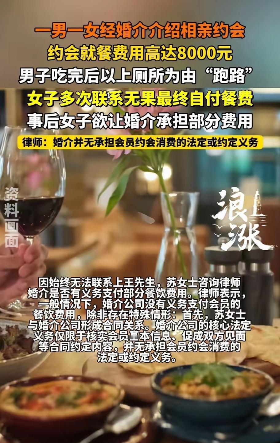 开局精彩,结局惨了!北京,一女子和相亲对象第一次见面,约在某高档餐厅,女子上来就点了一大桌子好吃的。刚吃完,男方就说去卫生间方便,女子以为男方借口去结账了,不料男方一去不回还关机。这顿饭花了8000,男方溜了,服务员不让走,女子支付8000后气炸:没少吃,还逃单,活该单身! 苏女士年轻漂亮,不知为啥,相亲总不成功。 她一直把相亲失败的原因归结为对方不够大方、不懂欣赏自己,这次经熟人介绍的男生条件体面,见面地点特意选在北京朝阳区一家主打海鲜与融合菜的高端餐厅,人均消费本就超过千元,她想借着这次见面,试探对方的经济实力与处事态度。 落座之后她没有和男方商量菜品,也没有询问对方的饮食禁忌,拿起菜单直接勾选了招牌佛跳墙、鲜活东星斑、进口牛排与多款进口红酒,搭配了冷菜、热菜、汤品与甜品,满满当当摆了一整桌,全程没有顾及对面男生的神色变化。男生全程沉默配合,没有提出异议,也没有主动参与点单,只是偶尔附和几句,安静吃完了这顿饭。 苏女士默认相亲饭局由男方买单是固定规矩,更是把这次高消费当成衡量男方诚意的标准,她看着男生起身走向卫生间,还在心里暗自笃定对方是去前台结账,甚至盘算着后续的相处节奏。她等了近半小时,始终不见男生返回,拨打对方电话才发现已经被关机,联系介绍人也得不到任何回应,直到服务员拿着消费清单上前,她才意识到自己被逃单了。 8000元的消费金额,对于普通工薪阶层来说,是近一个月的到手收入,就算是家境宽裕的群体,初次见面的便餐也极少达到这个标准。北京餐饮行业的消费数据显示,普通相亲饭局人均多控制在200至500元,超过千元的饭局大多用于亲友聚餐或商务宴请,初次见面就选择高客单价餐厅,还独自决定大额菜品,本身就超出了正常社交的合理范畴。 男生全程没有提出反对,却用逃单关机的方式逃避责任,这种做法既没有担当,也违背了基本的社交诚信。两人共同就餐形成事实消费关系,就算对消费金额存在异议,也应当面沟通协商,擅自离开并拉黑对方,不仅会让自己陷入道德争议,还可能涉及消费纠纷中的责任认定问题。 苏女士的愤怒可以理解,平白无故承担大额餐费,换做任何人都会难以接受,可她反复提及自己相亲屡次失败,却从未反思自身的社交方式。初次见面的核心是互相了解、感受相处氛围,而非用高消费试探对方,把饭局当成诚意考验,本身就偏离了相亲的初衷,也容易让对方产生抵触与反感的情绪。 不少年轻人在相亲过程中陷入误区,把物质条件摆在首位,用消费金额衡量真心,用铺张的排场判断家境,忽略了三观契合、相处舒适才是长期相处的基础。一方刻意铺张,一方逃避责任,最终落得两败俱伤的局面,既损失了金钱,也消耗了社交信任。 相亲本是寻找契合伴侣的正常社交途径,不该被物质化的标准绑架,更不该成为互相试探、彼此算计的场域。合理的消费、坦诚的沟通、互相尊重的态度,才是社交相处的基本底线,任何越过底线的行为,最终都会让原本有希望的交集,变成一场尴尬又闹心的闹剧。 各位读者你们怎么看?欢迎在评论区讨论。