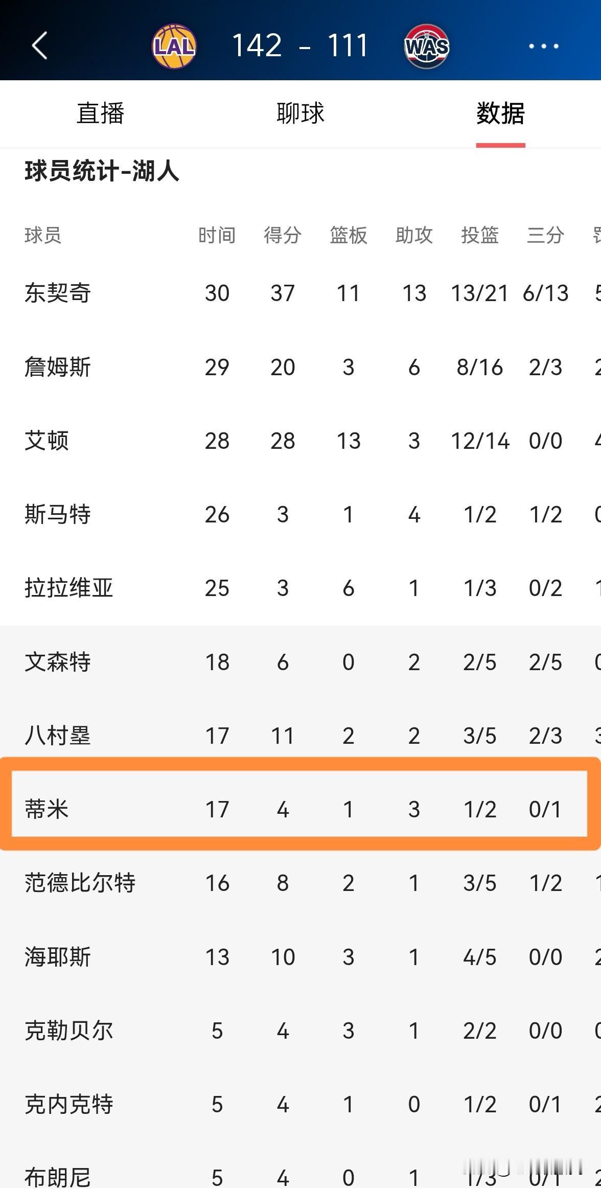 湖人大将蒂米绝对配得上更多的上场时间!在今天湖人客场以142:111大胜奇才的比赛中,蒂米替补出战17分钟,投篮2中1,其中三分球1中0、罚球2中2得到4分1篮板3助攻,他的场上正负值为+17。 老实说,蒂米是一名攻防实力都不错的球员,他可以在攻防两端都为球队提供非常大的帮助,我觉得蒂米要比拉拉维亚、文森特更适合湖人,蒂米绝对值得获得更多的上场时间。