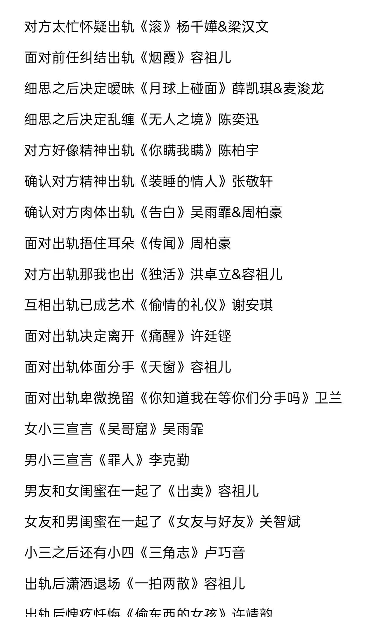 粤语歌就这样出轨出出出出出出到厌倦 统计了一下,林夕7首黄伟文5首陈咏谦4首林若宁3首李峻一1首,关于出轨的作词灵感还真是源源不断……不管了123乱缠!粤语歌 出轨
