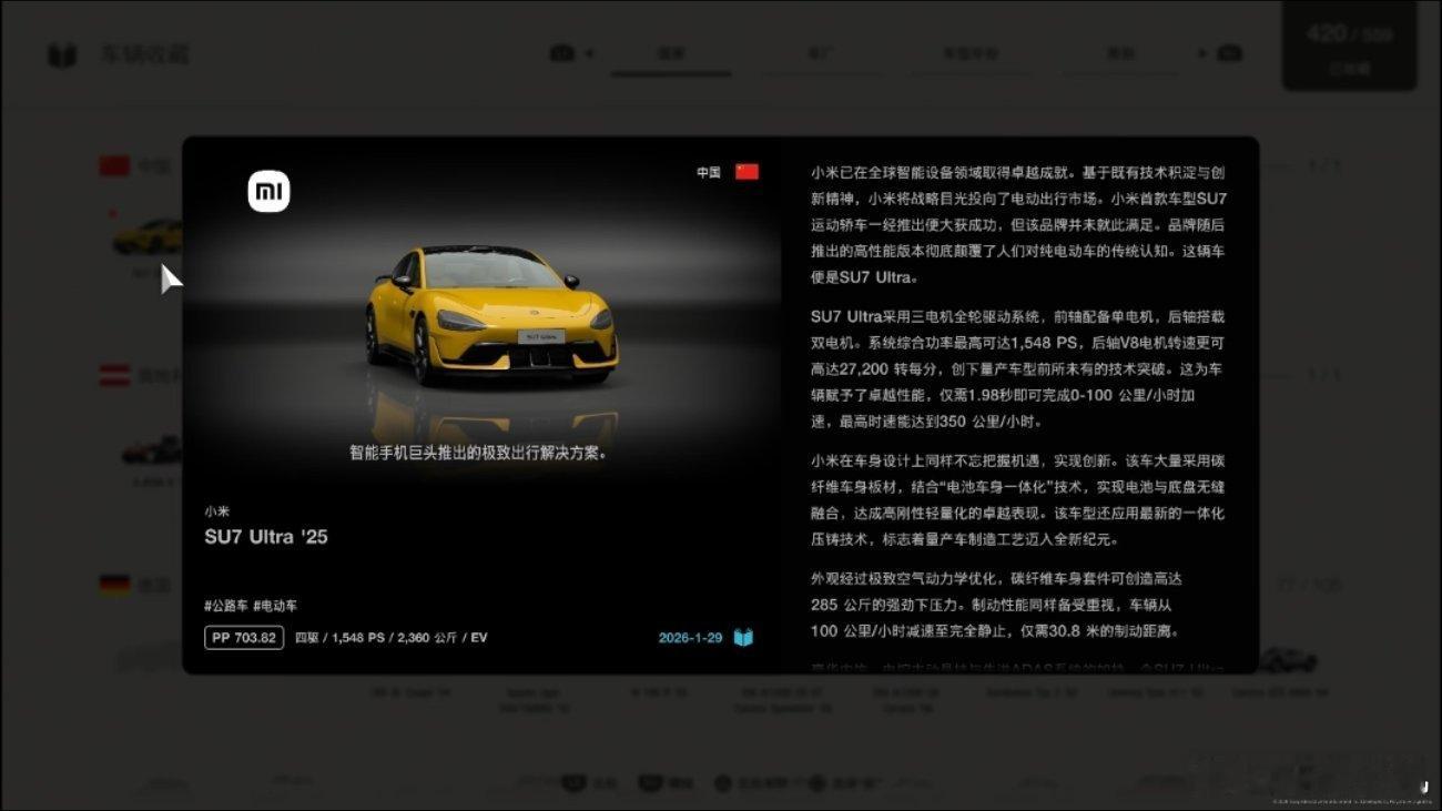 游戏gt7赛车联动小米su7ultra还挺用心的,不仅车辆建模完全还原,车辆介绍还对小米su7ultra评价很高,甚至游戏内博物馆还有小米公司的发展介绍。