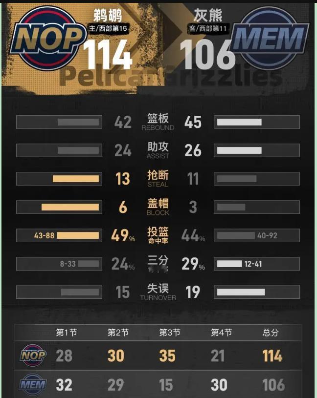 这比赛看得我直挠头!鹈鹕你说他行,他半场落后;你说他菜,第三节直接一波流打懵对手。但说实话,这场胜利反而让我更担心了——因为这根本不是体系赢球,纯属“手感抽风”的侥幸。 鹈鹕今天赢就赢在第三节那波35-15。可明眼人都看得出,那是灰熊自己断电送温暖!阿尔瓦拉多是拼,但球队真正的毛病一点没改:缺个正经控卫,进攻全靠单干。锡安、奎因、贝数据漂亮,但你看得出有啥战术吗?球权分不明白,关键时刻谁拿球?这“三核”现在就是各打各的,遇到强队准露馅。 反过来看灰熊,四连败真别怪运气。缺莫兰特不是借口,防守体系全崩了才是关键!以前那支铁血灰熊,这场让人一节打花,内线轮转跟慢放似的。小杰克逊撑不起核心,角色球员零敲碎打,这队现在既没硬解能力,也没防守韧性。你说他们想摆烂还是冲附加赛?自己恐怕都迷糊。 所以哪是什么菜鸡互啄?这就是西部底层的残酷生存战!鹈鹕偷到一场,可问题一个没解决;灰熊连败不止,那是建队思路出了断层。球迷也别光看热闹——鹈鹕球迷得冷静,你们离稳定强队还远;灰熊球迷得耐心,要么彻底重建,要么咬牙补强。 赢一场不是春天,连败也不是末日。在狂野西部,只有对自己够狠,才能爬出泥潭。两队都长点心吧,别再让球迷坐这过山车了!奎因22+9+7贝22+8锡安21分 鹈鹕击败灰熊