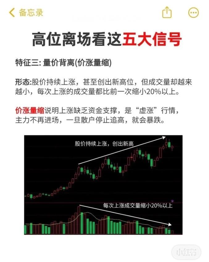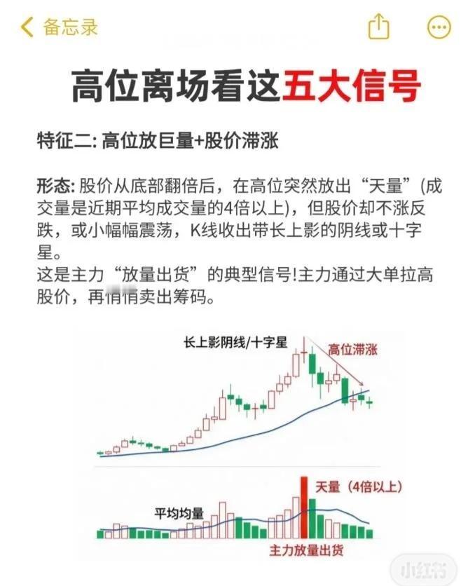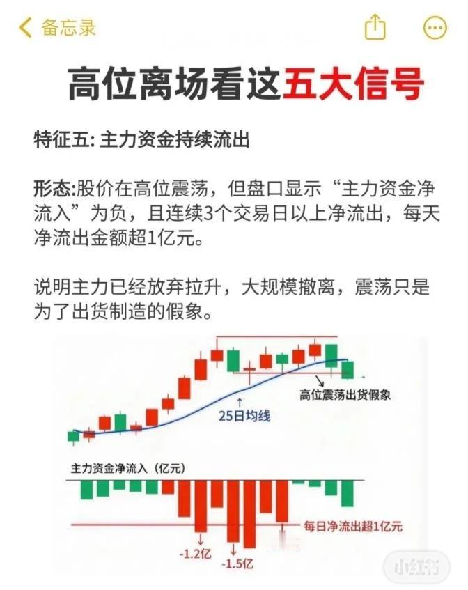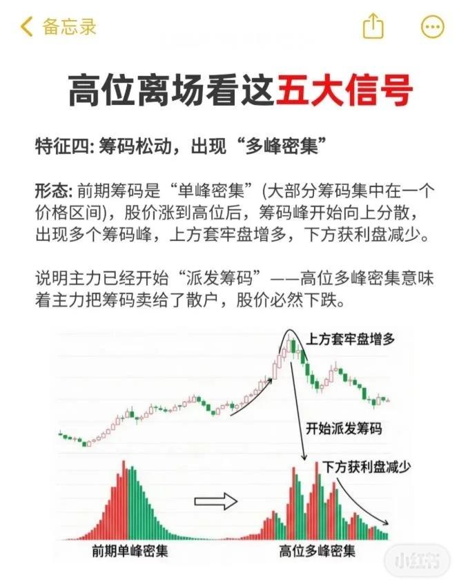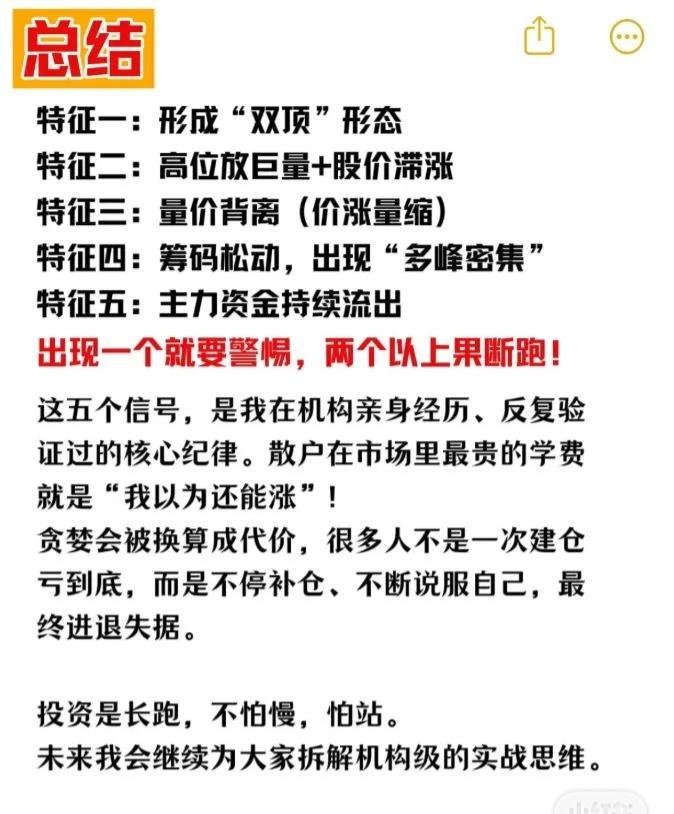 在股价高位出现五大危险信号时,应果断离场,避免被套。 五大高位离场信号: 双顶形态:股价两次冲高形成“M”型,第二顶成交量缩小,是主力二次诱多出货。 高位放巨量+股价滞涨:天量成交但股价不涨或小幅震荡,K线带长上影或十字星,属放量出货。 量价背离(价涨量缩):股价创新高但成交量逐步减少20%以上,上涨缺资金支撑,易暴跌。 筹码松动,多峰密集:高位筹码由单峰变为多峰,上方套牢盘增多,主力派发筹码给散户。 主力资金持续流出:高位震荡且连续3日以上主力资金净流出超1亿元,是出货假象。 操作建议:出现一个信号要警惕,两个以上果断离场。这是机构验证的核心纪律,贪恋上涨易被市场惩罚。 延伸提醒:投资是长跑,理性止损比盲目补仓更重要。