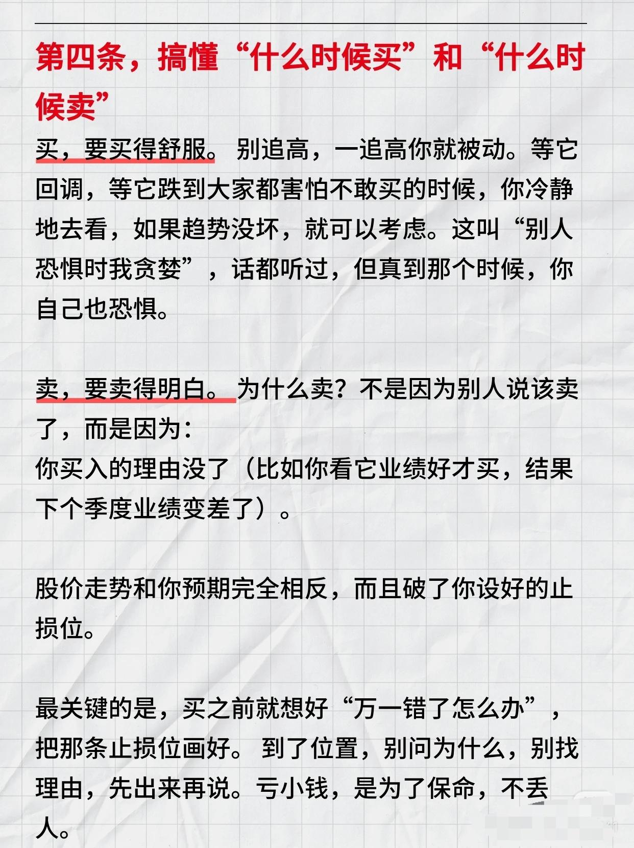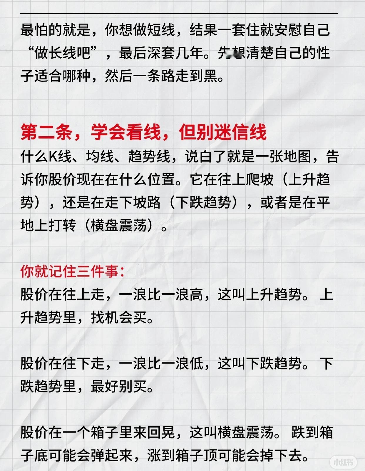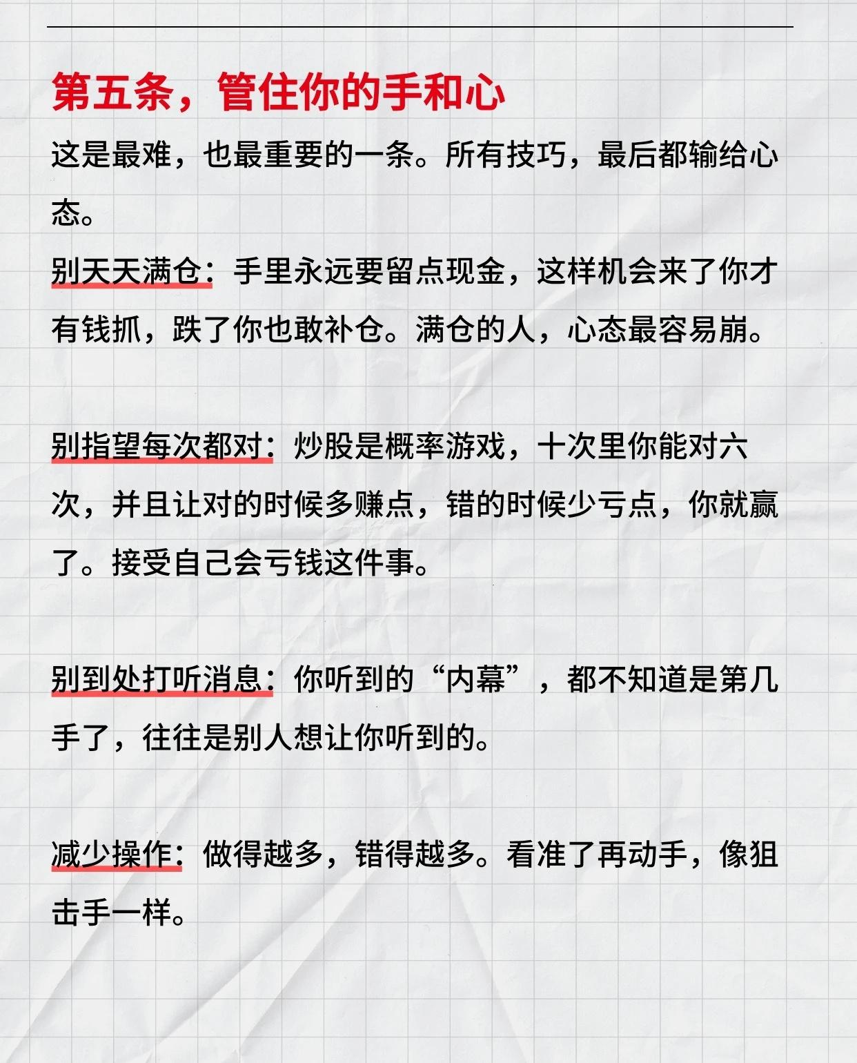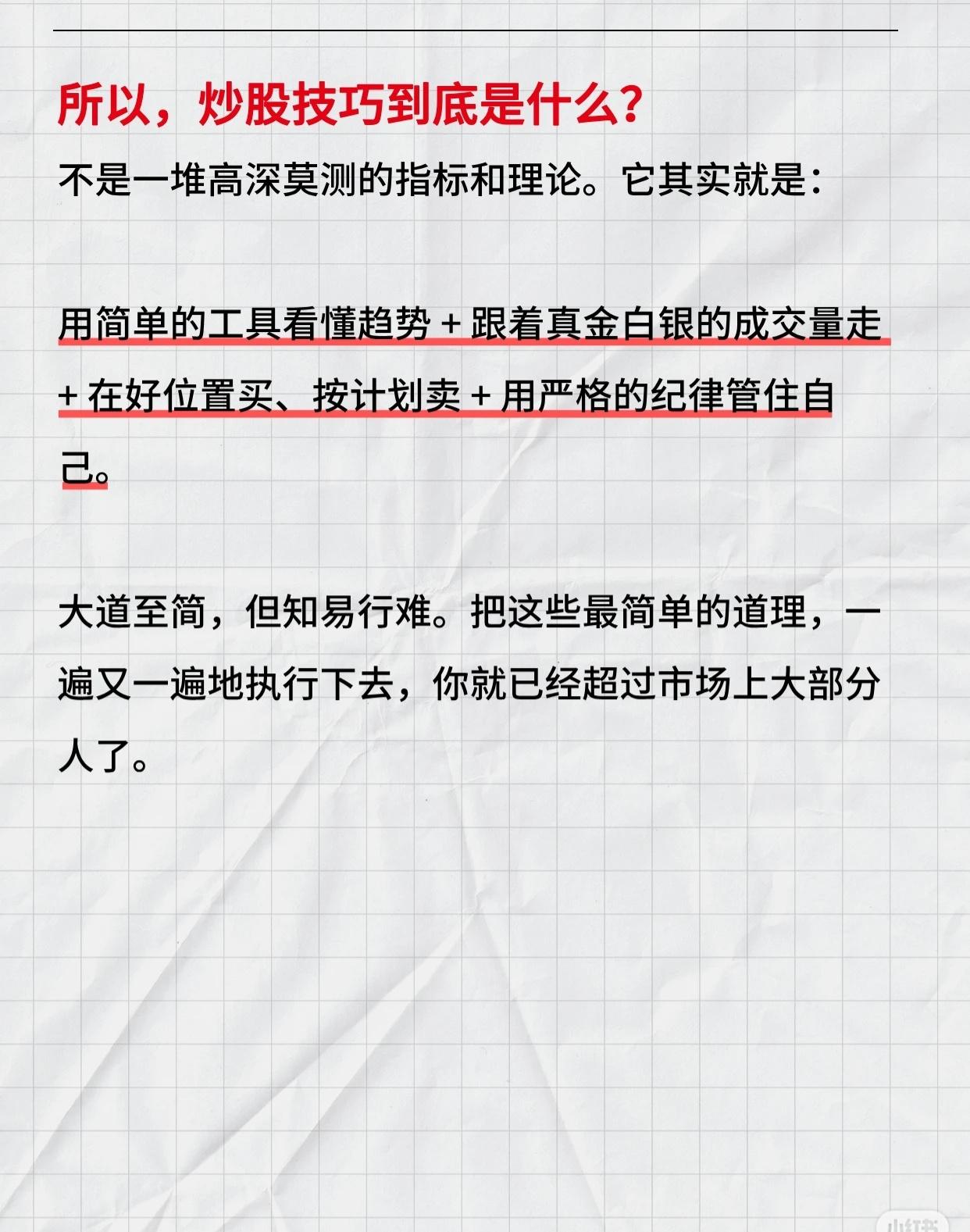 炒股的核心技巧,可概括为以下几点: 看清资金流向:成交量是“油”,股价是“车”,放量上涨是加速,缩量上涨要警惕,放量下跌风险大,缩量下跌相对可控,机会跟着钱走。 把握买卖时机:买要等回调、趋势未坏时;卖要因理由消失或破止损位,提前设好止损。 管理心态与操作:不满仓、接受亏损、不信小道消息、减少频繁交易,保持纪律。 技巧本质:用简单工具看趋势,跟成交量,择机买卖,严格自律,坚持执行即可超越多数人。 核心:顺势、跟量、守纪律。