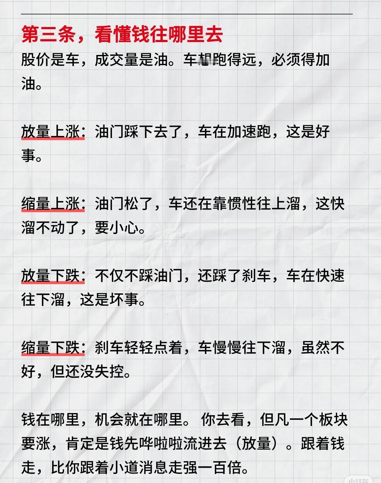 炒股的核心技巧,可概括为以下几点: 看清资金流向:成交量是“油”,股价是“车
