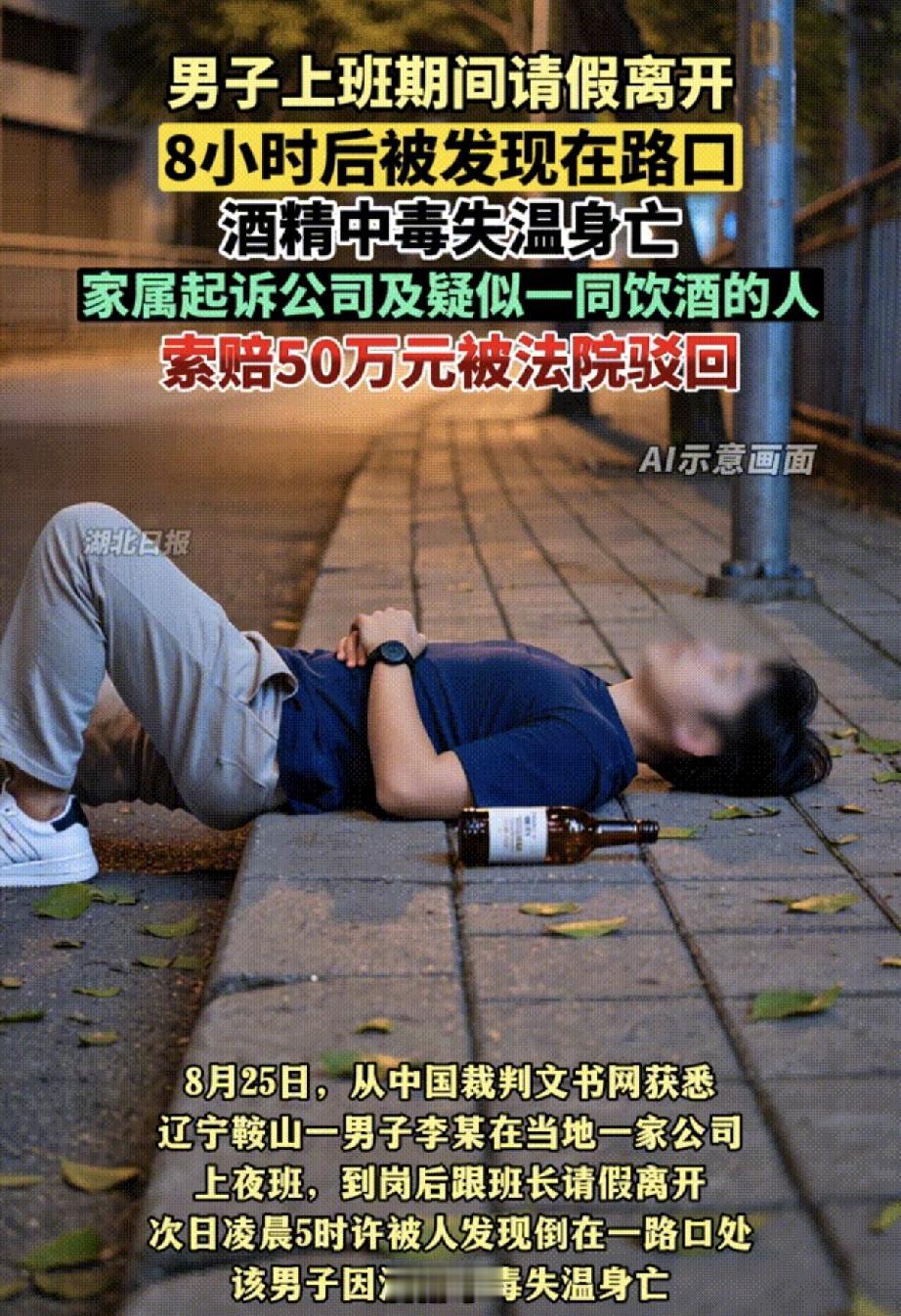 一名男子请假后饮酒中毒身亡,家属竟将单位告上法庭,理由让人瞠目:“单位没督促他回来上班”!这事就发生在辽宁鞍山。 去年2月的一个晚上,夜班员工李某以家中有事为由向班长请假,获得批准后离开单位。谁料次日凌晨,他竟被发现在路边身亡,鉴定结果显示为酒精中毒导致失温。 更令人意外的是,李某家属随后将单位告上法庭,索赔理由让人匪夷所思:在李某离岗后8个多小时里,单位没打电话询问或督促其回岗,属于“怠于管理”。 法院判决斩钉截铁:单位无责!法官说得明白:员工请假后的私人活动超出单位管理范围,李某作为完全民事行为能力人,应对自身行为负责。 这判决给所有人提了个醒:成年人首先得对自己负责,别把锅乱甩!你怎么看这件事?你们单位对员工请假后有什么管理规定?喝酒死亡赔偿 饮酒事故