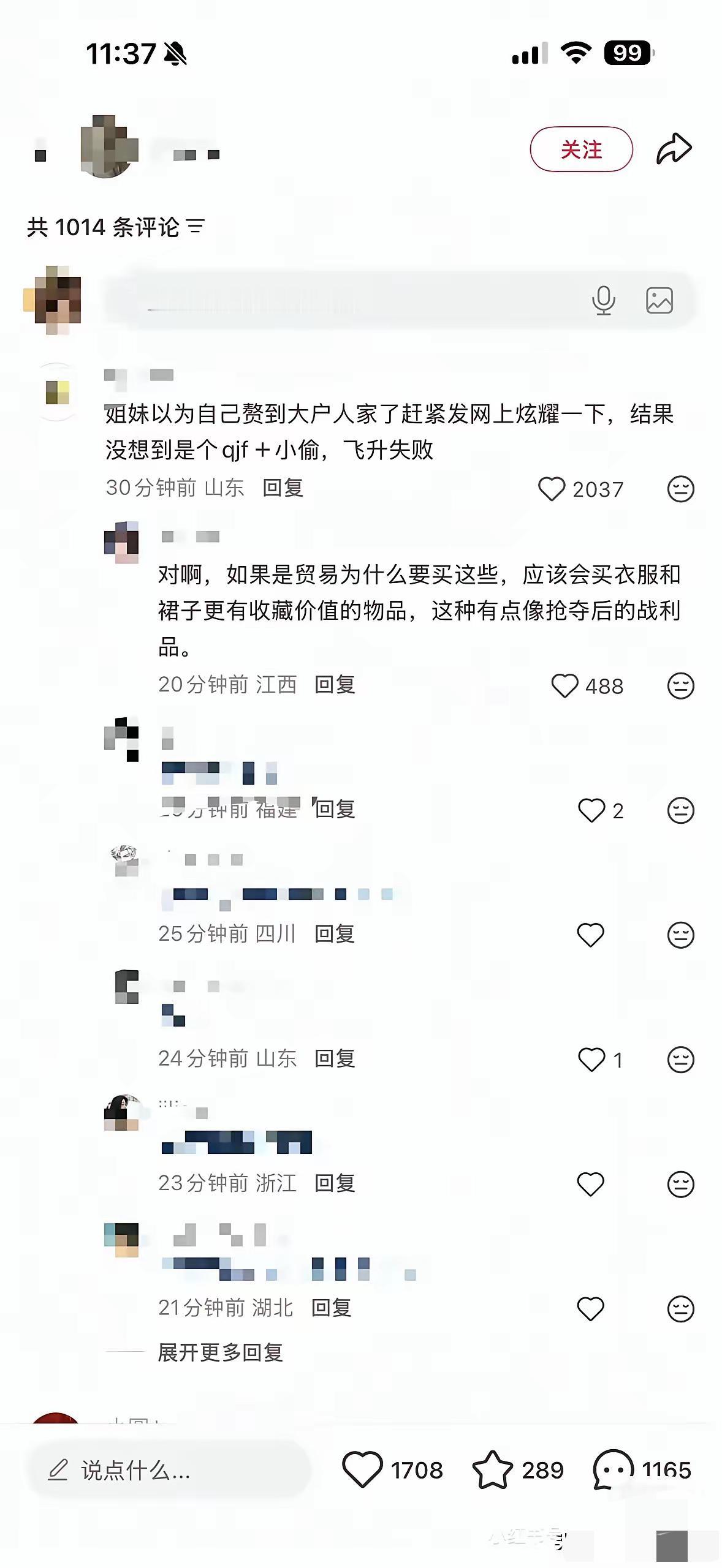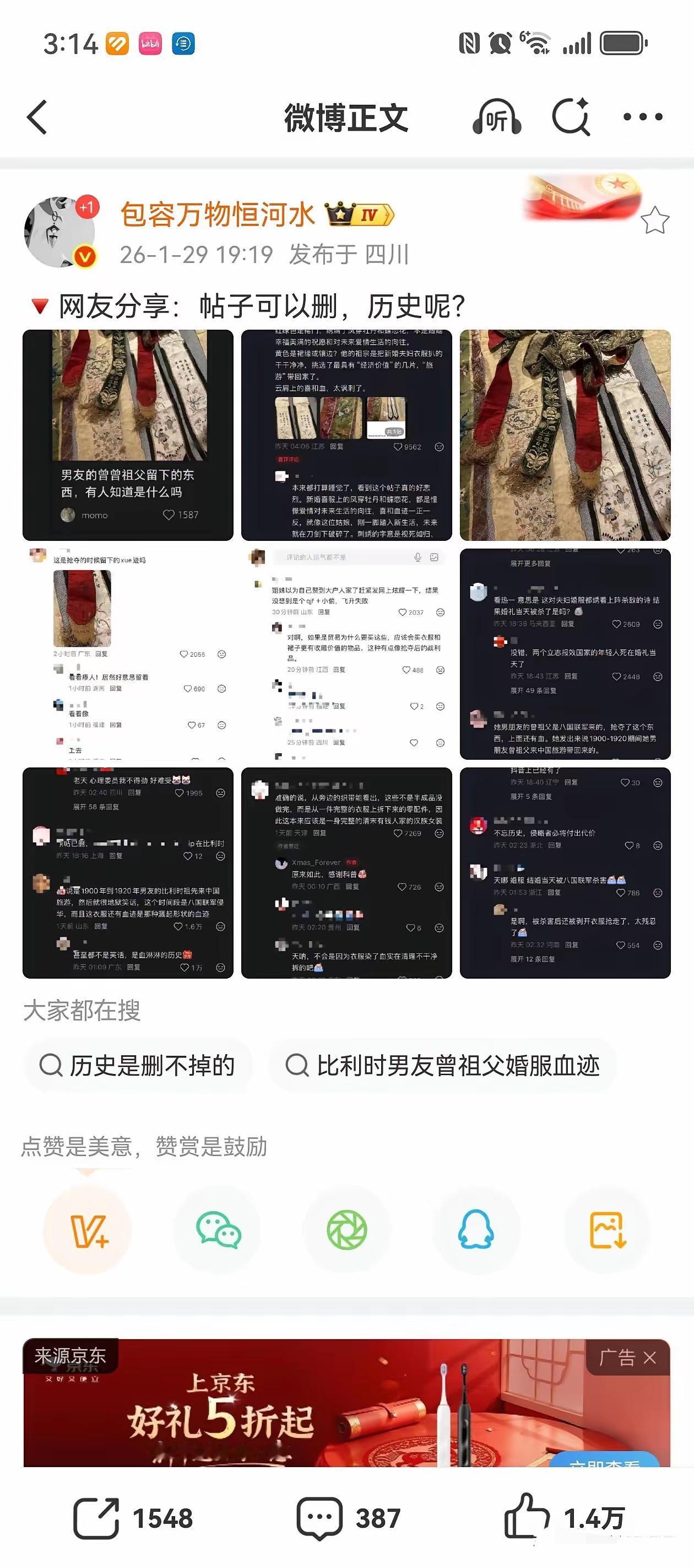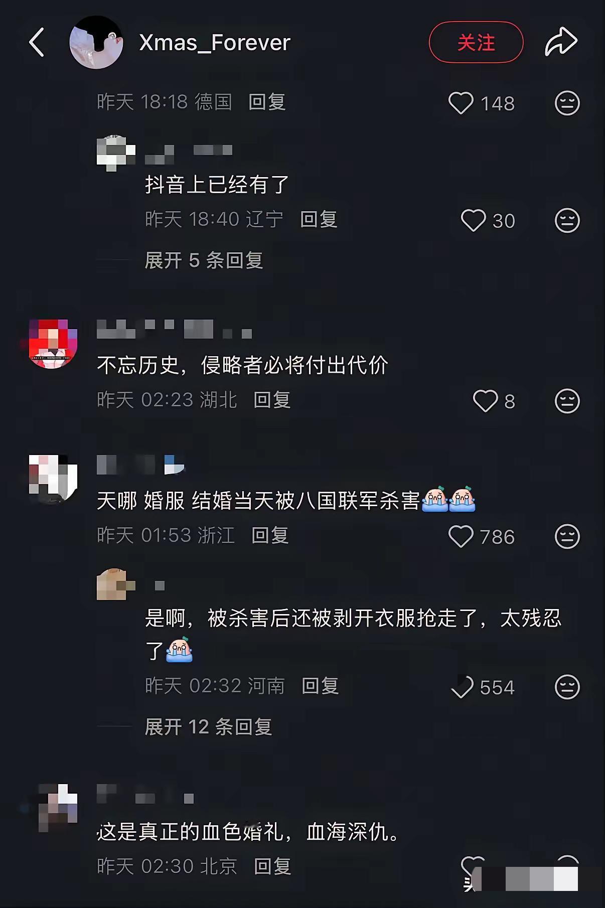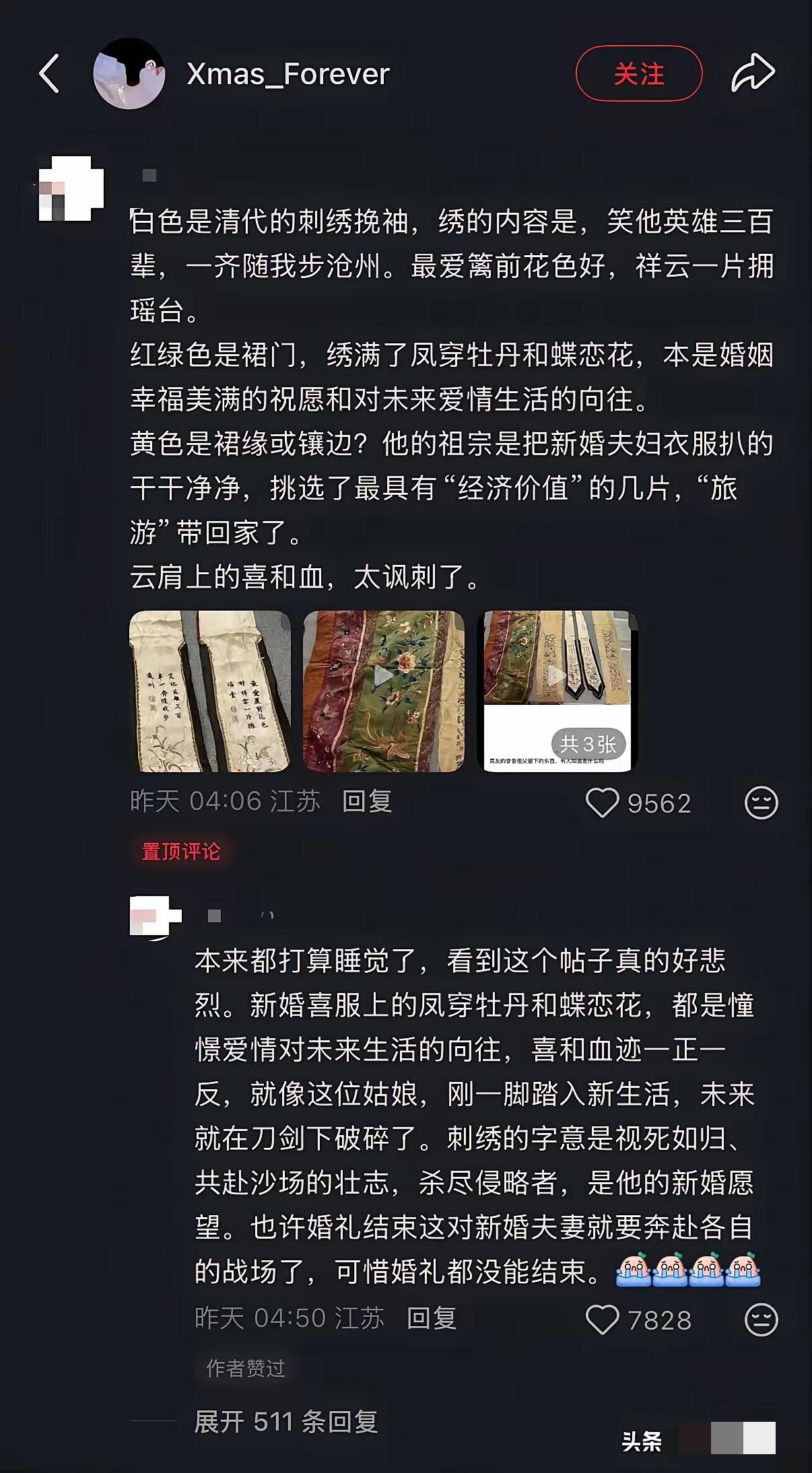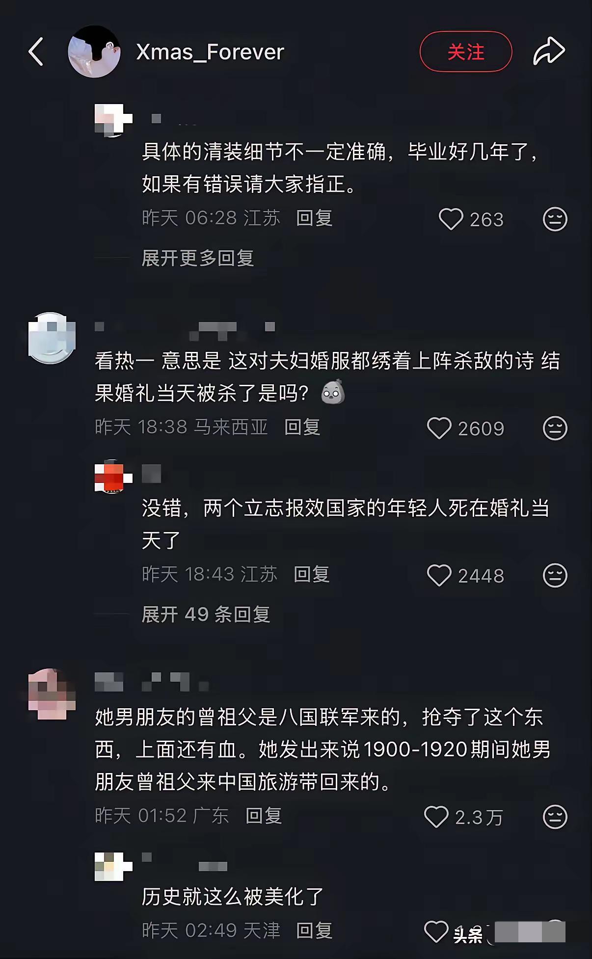 把洋人屠戮中国先辈的罪证当成荣耀炫耀,这不止是无知,更是突破底线的无耻,这件事戳中了无数国人的痛处。 这件沾着血迹、绣着爱国诗句的嫁衣,根本不是什么传家宝,而是清末侵略者烧杀抢掠的铁证,是先辈横遭劫难的血泪印记,女子却拿着它在网上大肆显摆,完全忘了这段刻在民族骨血里的伤痛。 舆论发酵后,她火速删帖消失,连直面批评的勇气都没有,这恰恰印证了她的认知扭曲与良知缺失。忘记历史就是背叛,拿国耻当谈资,既不尊重逝去的同胞,也丢掉了中国人的骨气与底线。 真正的自尊自爱,从来不是依附他人、追捧赃物,而是铭记历史、守护民族尊严。面对这样的行为,你觉得最该警醒的是什么?