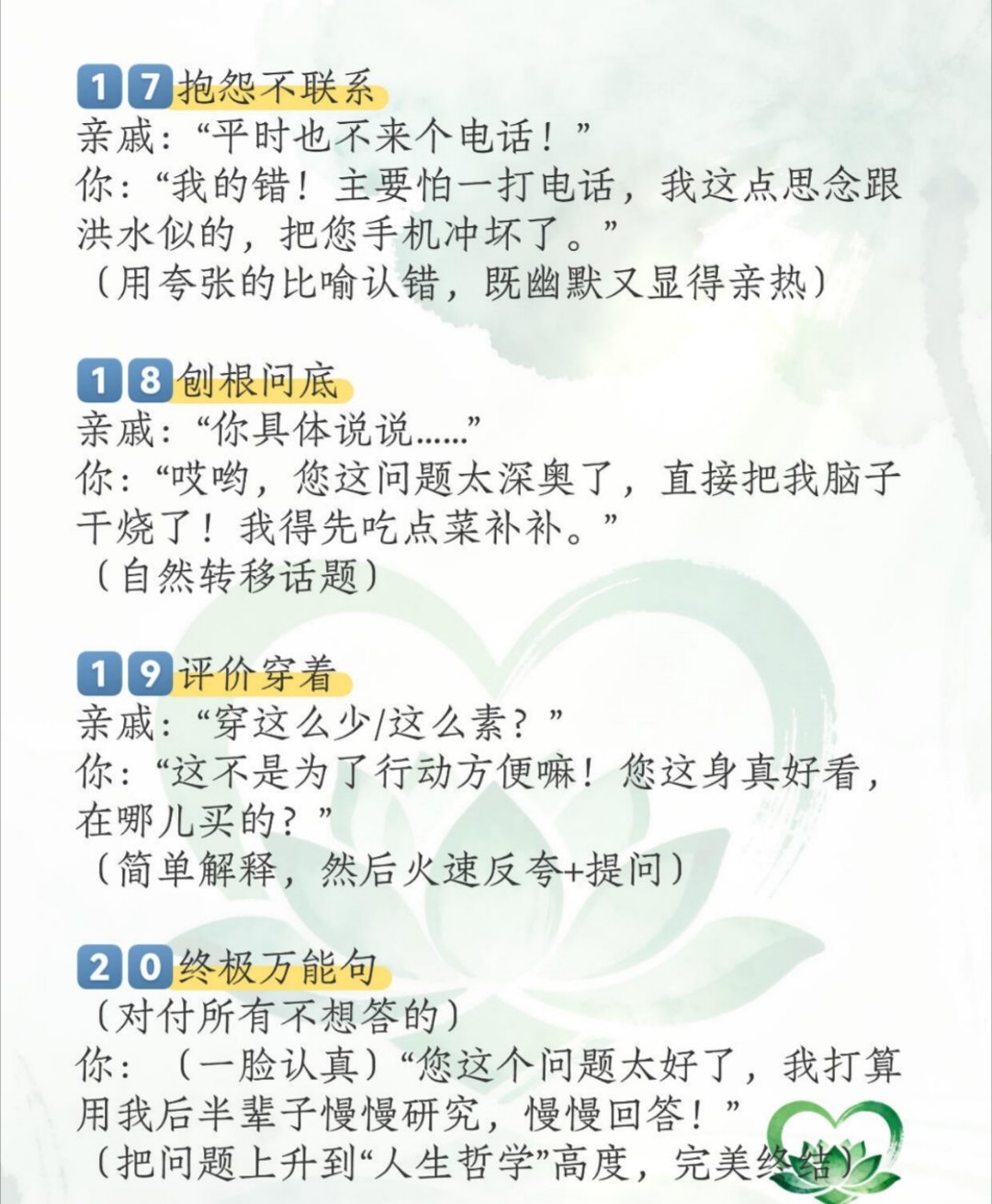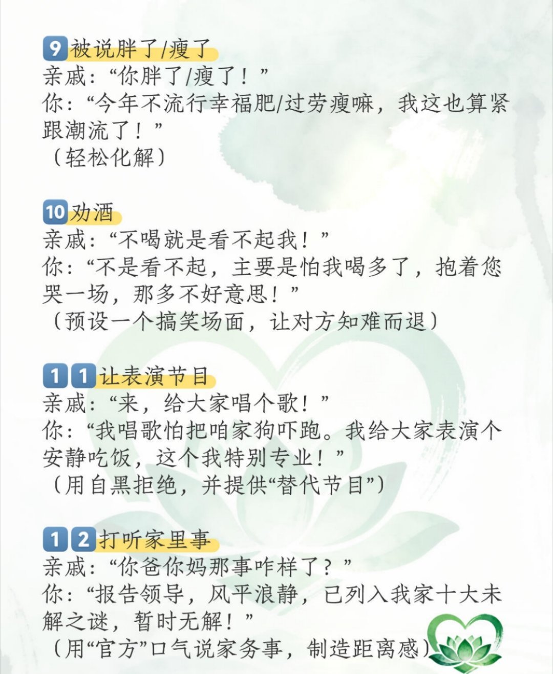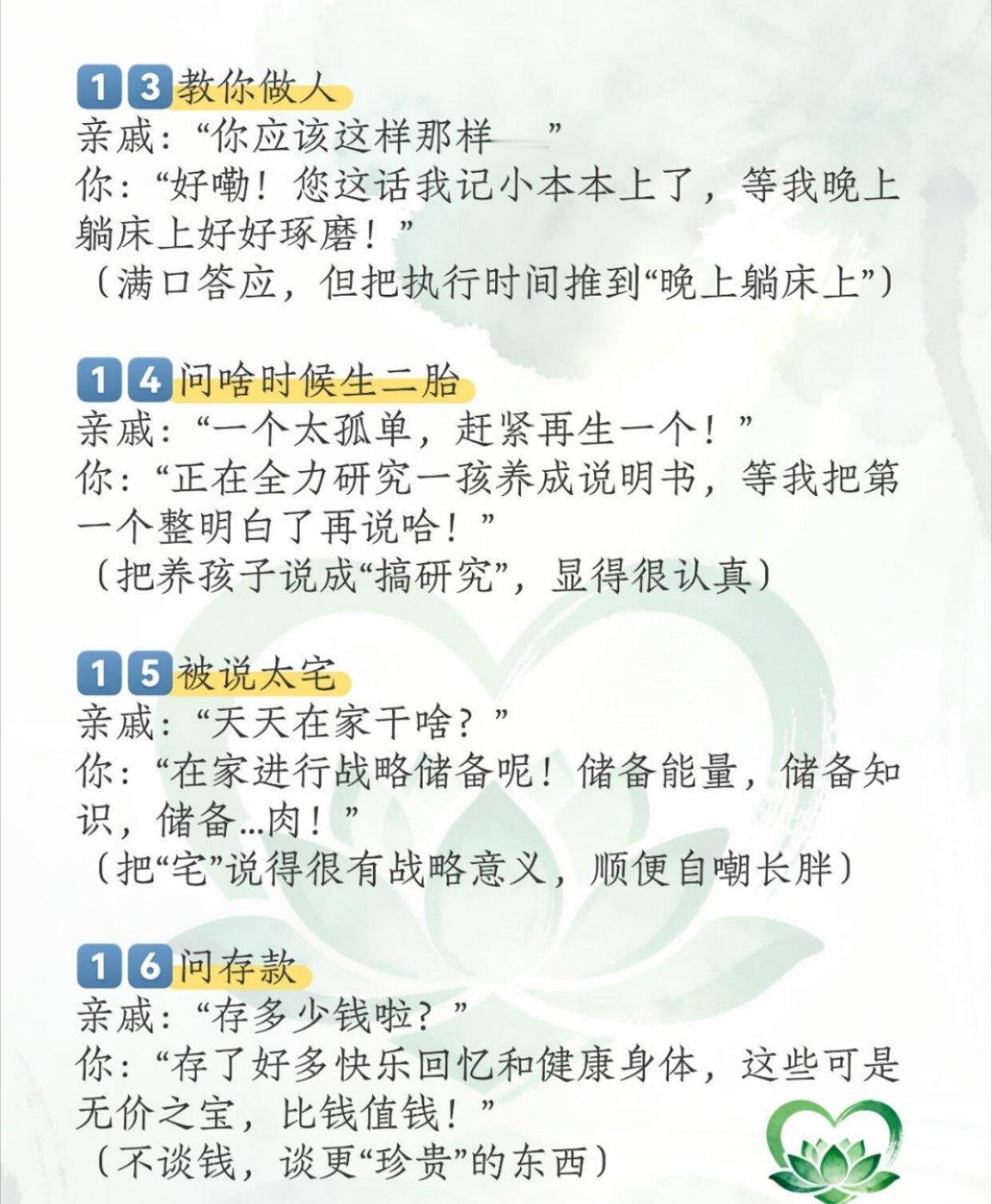 过年走亲戚,在饭桌上难免会有灵魂拷问,想要愉快轻松的度过春节聚餐,看看这20句见招拆招的盘问回话吧