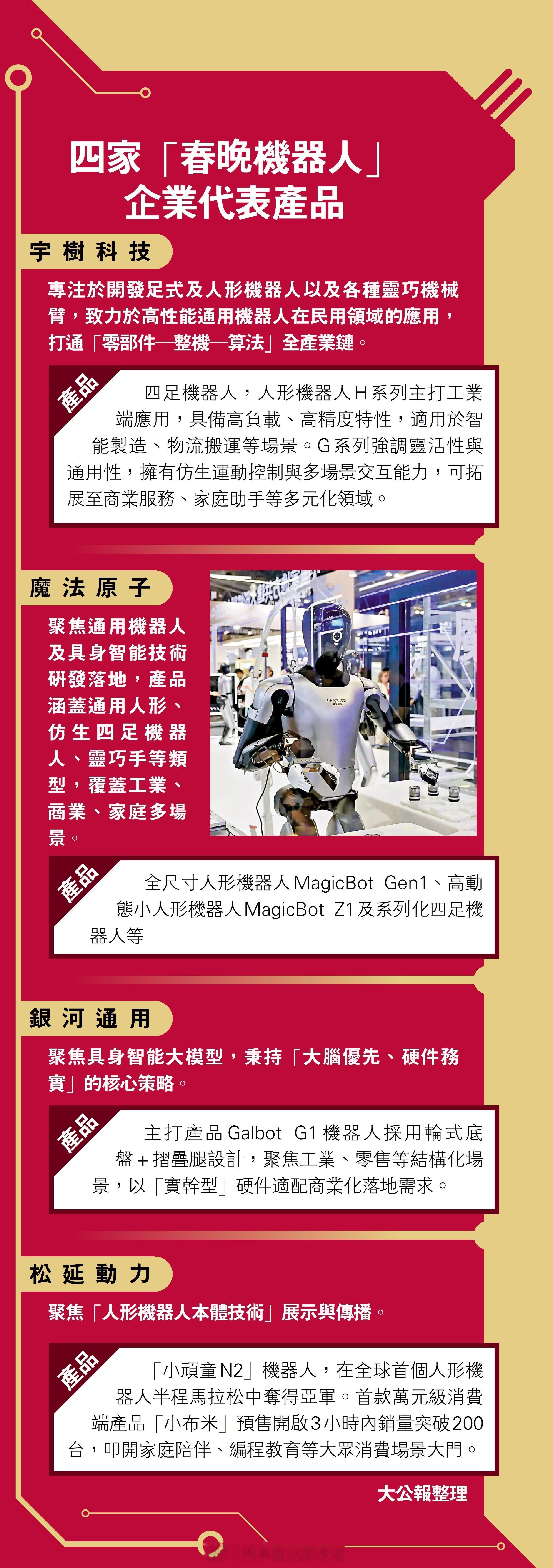 AI 人工智能 机器人 「春晚 機器人「天團」擴容..自主表演萬眾期待 … (大公報 記者 郭瀚林)繼2025年的機器人秧歌秀 後,即將上演的中央廣播電視總台2026年春節聯歡晚會 ,預計會有更多人形智能機器人登台,帶來硬科技 盛宴。目前,已有四家人形機器人相關企業先後官宣成為2026年春晚 合作夥伴。其中既包括多次亮相春晚的「老資歷」宇樹科技,也有首屆全球人形機器人半程馬拉松亞軍機器人「所屬」的松延動力、機器人落地零售業成為「店小二」的銀河通用,以及來自江苏省 的機器人企業魔法原子。據了解,2025年,中国人形机器人 整機企業數量超140家,發布人形機器人產品超330款,其「能幹活」的實用屬性也日益顯現。此次多家機器人企業「組團」登台春晚,可望將預設程序的重複動作表演升級為自主實時的互動。2025年春晚舞台上,宇樹科技的H1 人形機器人以精準的秧歌舞步驚艷了海內外觀眾。在全球首屆人形機器人運動會上,宇樹科技機器人勇奪四金,是獲得金牌數和獎牌數最多的公司。宇樹科技26日宣布,再度成為2026年春晚機器人合作夥伴,攜手總台奉獻一場引領全球科技進步的除夕盛宴..」入內看全文:网页链接 即时娱乐新闻 娱乐圈 电视 音乐 乐坛 资本市场 股票 科网股 科技股 机器狗 金融 财经 ..………. 香港