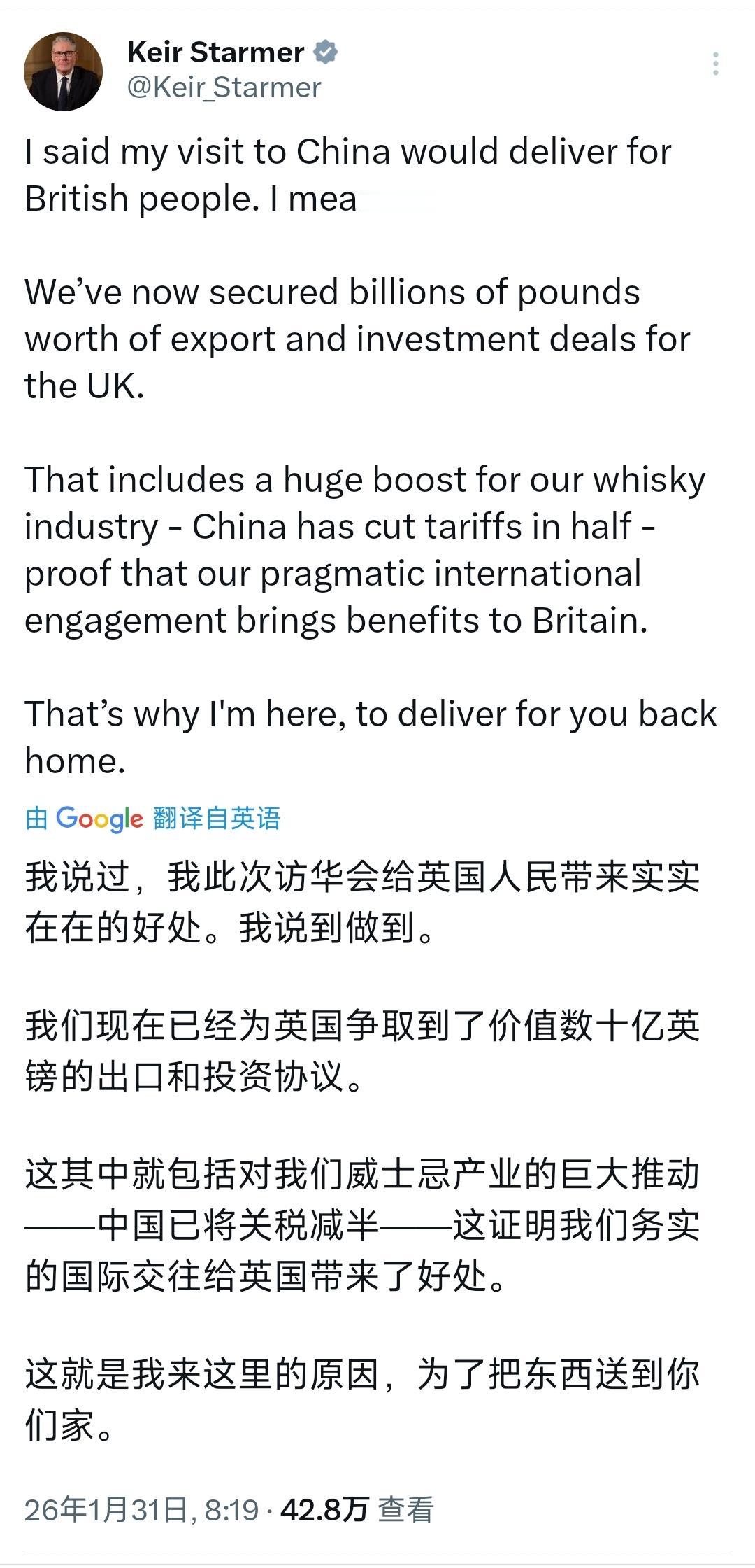 英国首相斯塔默今天(1月31日)发文写道:“我曾说过,此次访华之行要为英国民众办实事,此言非虚。目前我们已为英国敲定价值数十亿英镑的出口与投资协议,其中英国威士忌产业收获重大利好——中国已将相关关税减半,这恰恰印证了我们秉持务实的国际交往态度,能切实为英国带来益处。我此次到访,初衷正是为了给国内的你们谋福祉。” [机智]评几句:斯塔默总算拎清了中英关系的核心要义,数十亿英镑协议落地、威士忌关税减半,实打实印证了中英务实合作互利共赢,既解了英国经济的燃眉之急,也给两国经贸往来添了底气,这本就是顺应大势的明智之举。可笑的是特朗普跳出来喊“危险”,满脑子霸权算计只想把英国绑上反华战车,国内法拉奇、特拉斯之流也跟风聒噪,拿意识形态绑架国家利益。说到底,英国的民生福祉从不在政客的口舌之争里,而在实打实的合作红利中,希望斯塔默能守住这份务实初心,顶住外部施压与内部杂音,别让眼前的共赢成果沦为政治博弈的牺牲品,毕竟选对华合作的正道,远比盲从霸权的歪路更对得起英国民众。
