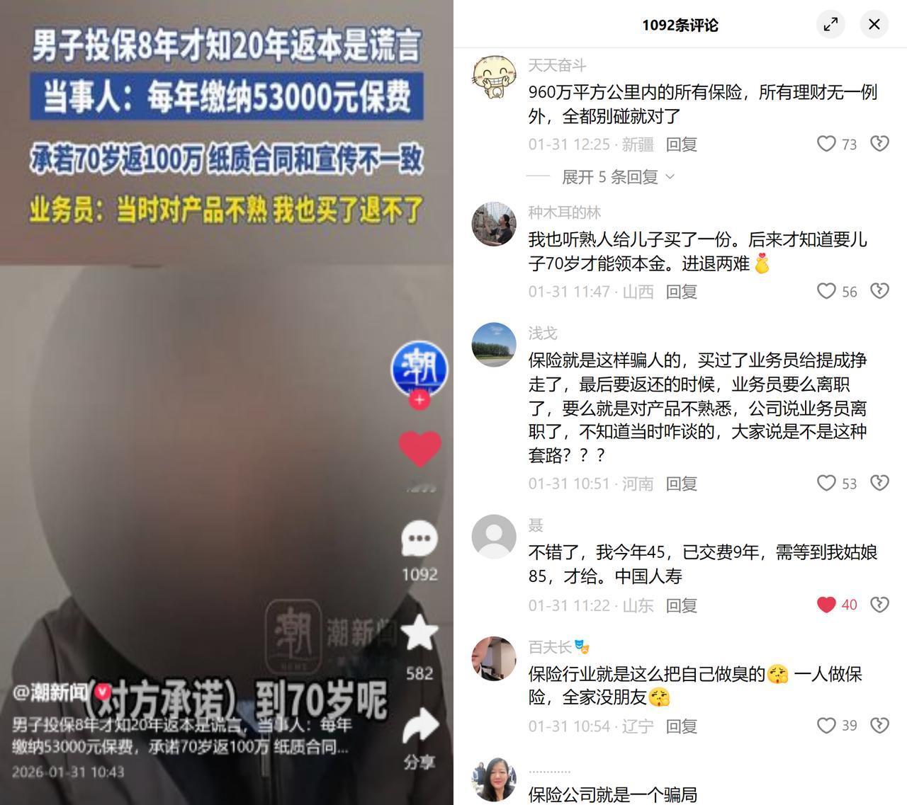 投保8年才知返本是谎言 一位投保人每年交五万多保费,被业务员拍胸脯保证20年返本、70岁能拿100万。等交了8年才发现,合同是纯保障型终身重疾险,半字没提返本,连70岁的特殊给付都没有。业务员说自己当年也不懂产品,现在想退保,本金得亏大半。 这事儿看着气人,就是行业里的老套路。为了冲业绩,业务员专捡老百姓爱听的保本、高息说,把纯保障产品包装成理财险。而大部分人要么信了熟人的面子,要么嫌合同字多看不懂,稀里糊涂就签了。更坑的是,这类重疾险前20年现金价值远低于已交保费,退保就是割肉,不退就只能硬扛。随处可见同款受害者,一人卖保险,全家没朋友的调侃,早成了行业信任崩塌的注脚。 下次再有人跟你说买保险能返本,别着急掏钱,先翻到合同最后,看看现金价值表再说。