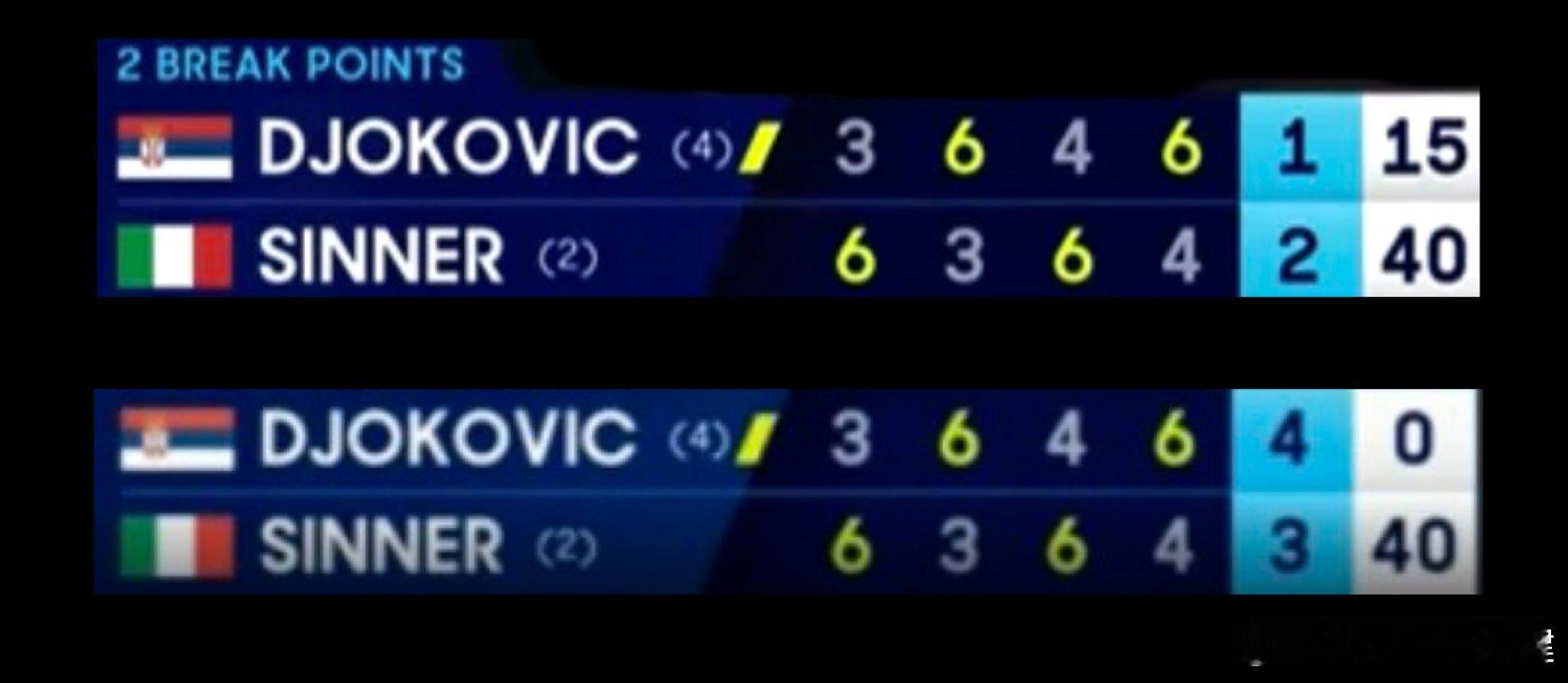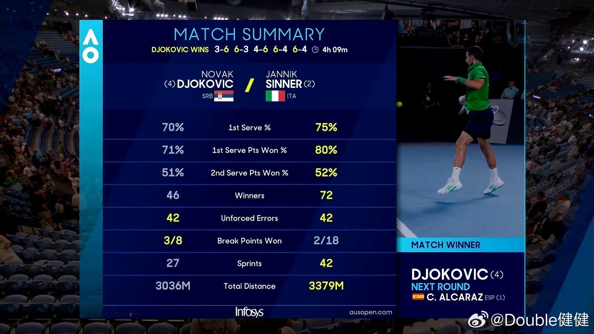 辛纳第五次在大满贯总得分占优情况下输球:+12分 VS德约科维奇 (2026澳网)+5分VS阿特梅尔 (2023法网)+4分 VS梅德韦杰夫(2024温网)+2分 VS阿尔卡拉斯 (2024法网)+1分 VS阿尔卡拉斯 (2025法网)德约科维奇第四次在大满贯总得分落后情况下赢球:-24分 VS孟菲尔斯 (2000美网)-14分VS费德勒(2019温网)-12分VS 辛纳 (2026澳网)-4 分VS费什 (2006美网)德约科维奇重返澳网决赛德约科维奇3比2辛纳这很澳网