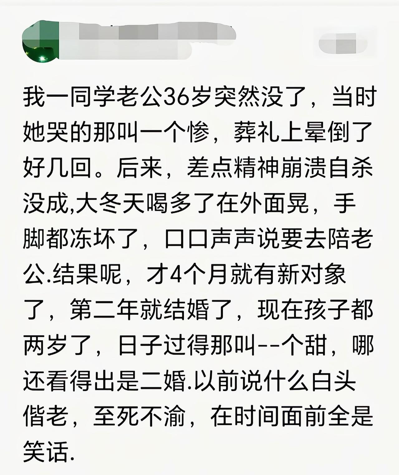 有没有可能,前面她是靠她老公养活的,老公司了,生活质量断崖下降,所以才会崩溃大哭。后面找到接盘侠了,那也就不必要难过了。