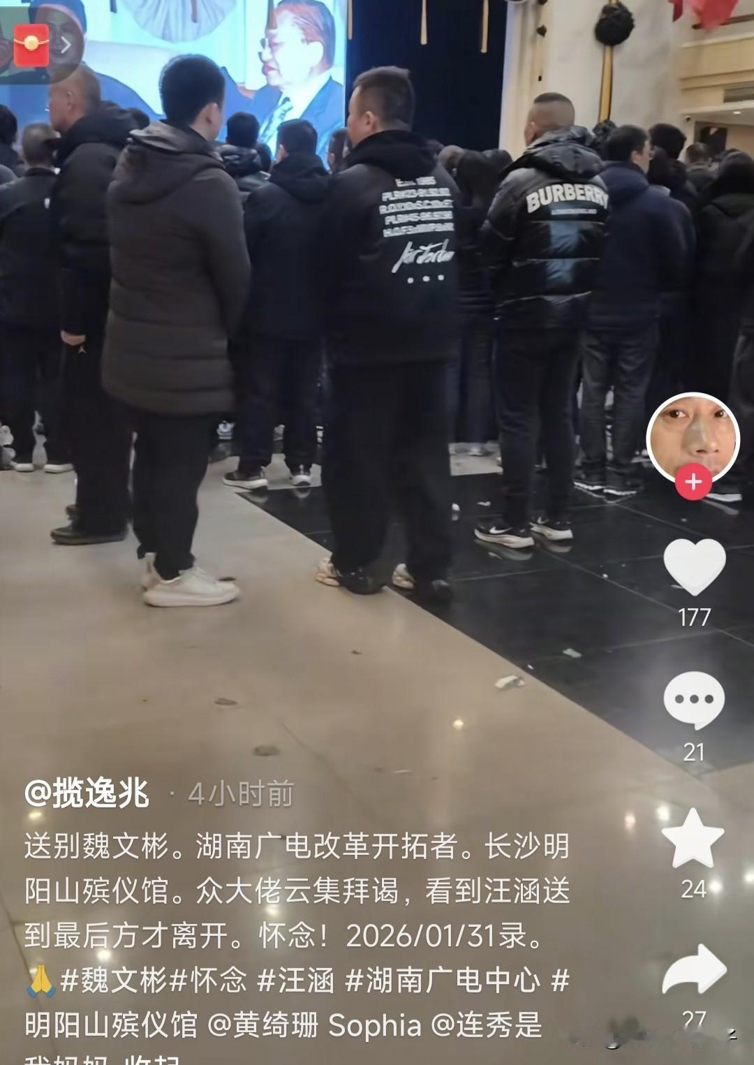 汪涵、李维嘉都来了!魏文彬追悼会上,众人纷纷在灵堂跪拜…… 1月31日,一大早,有网友晒出魏文彬追悼会现场视频,灵堂布置的庄严肃穆,摆着花圈和遗照,前来悼念的人络绎不绝。 画面中,看到了主持人李维嘉的身影,面色凝重,瘦了很多。 视频中,很多人在灵堂跪拜,发布者用大佬云集来形容,可见都是有头有脸的人物,说实话,这一幕,有点小震撼。 诚然,魏文彬能被称为“芒果之父”,又创办了《快乐大本营》节目,深受敬仰也可以理解,不过,感觉只有亲人和家人才行跪拜之礼吧,不太懂。 此外,该网友还透露汪涵也来了,而且送到最后才离开,视频中,并没看到身影,有人猜测在跪拜者当中。 其实,汪涵和维嘉到场,一点也不意外,毕竟,来悼念老前辈,理所应当。 反而,没看到谢娜和何炅的身影,有点出乎意料,或许比较低调,不像被拍到吧! 不管怎么,愿逝者安息,一路走好!