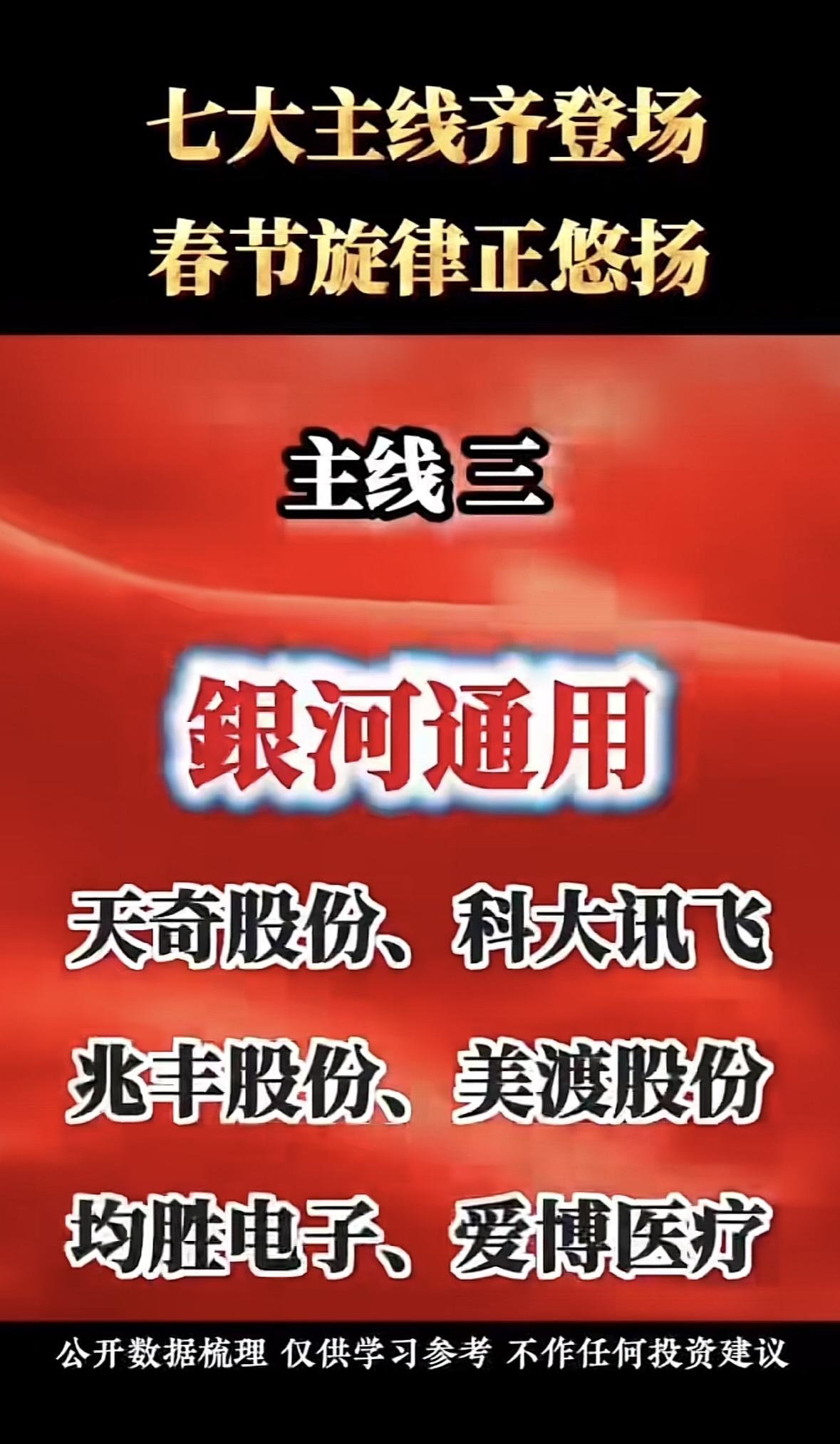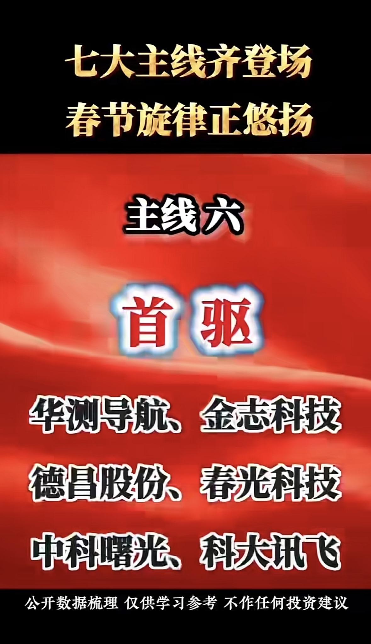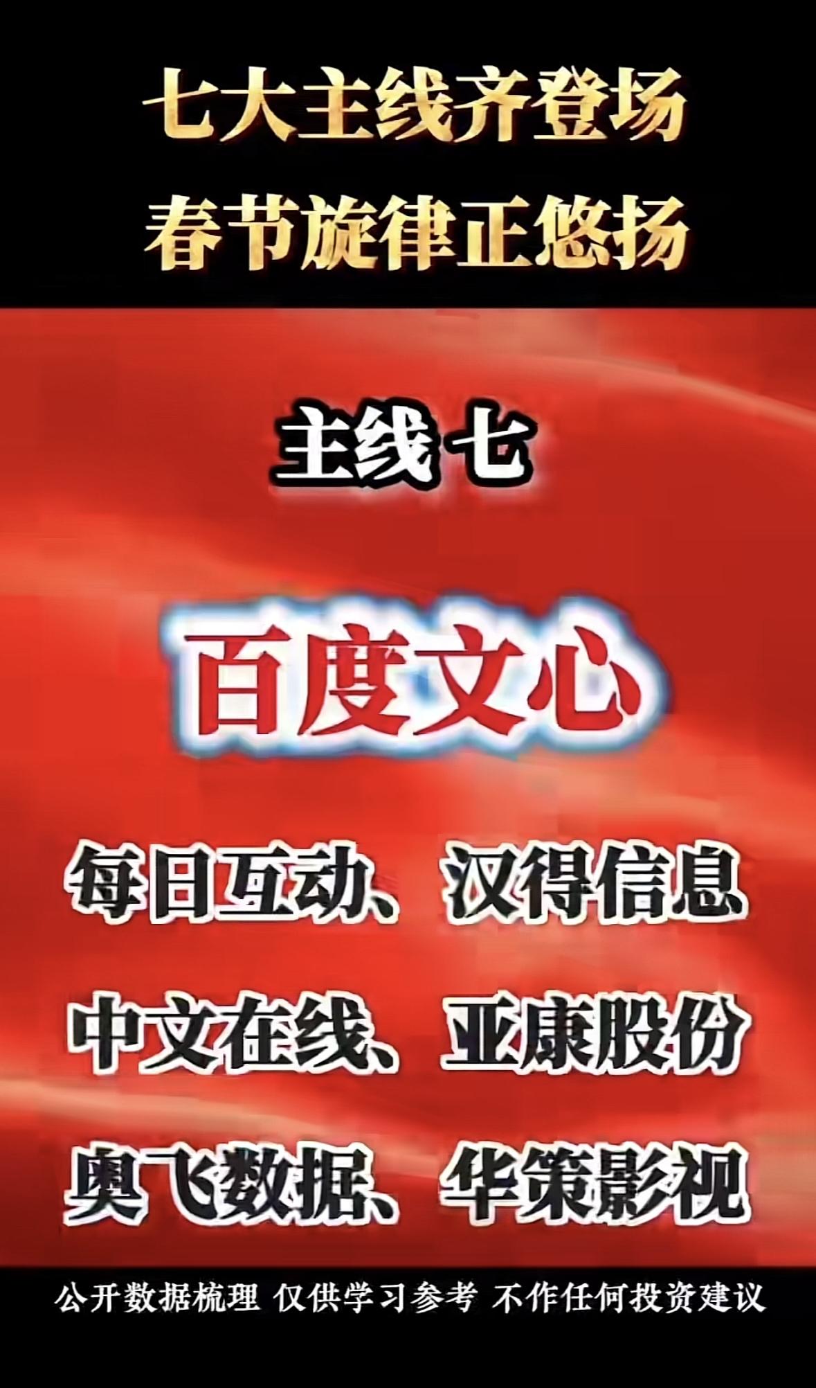 七大主线齐登场,春节行情正悠扬! 春节行情七大主线启动,腾讯元宝领衔科技股,数据与基建板块跟涨,仅供学习参考。 春节行情启动,七大主线轮动。科技股领涨,数据与AI概念活跃。市场热情升温,投资需理性。