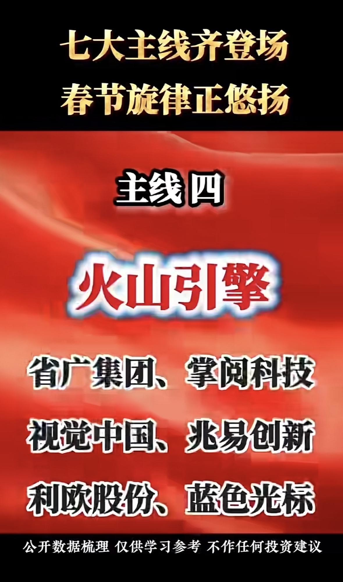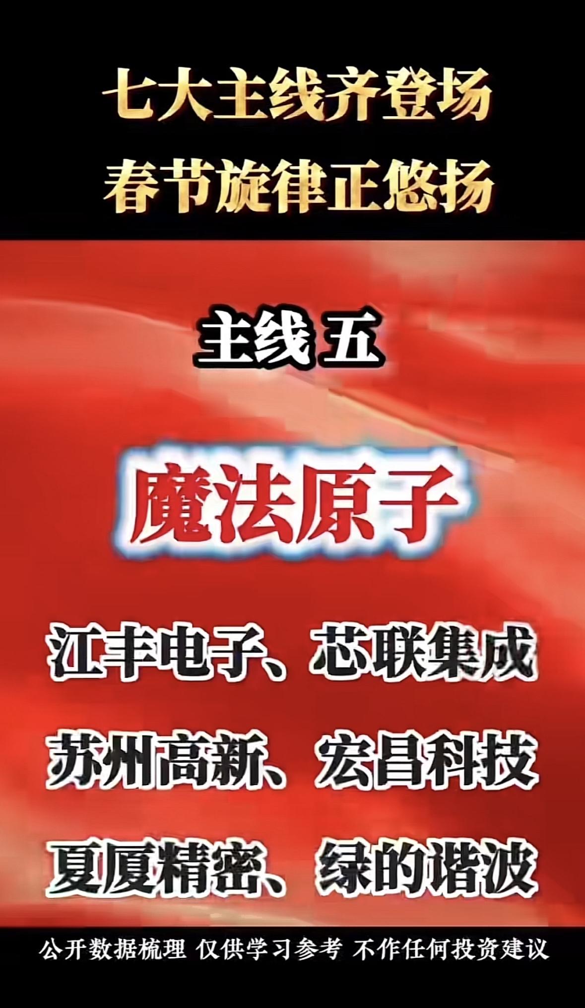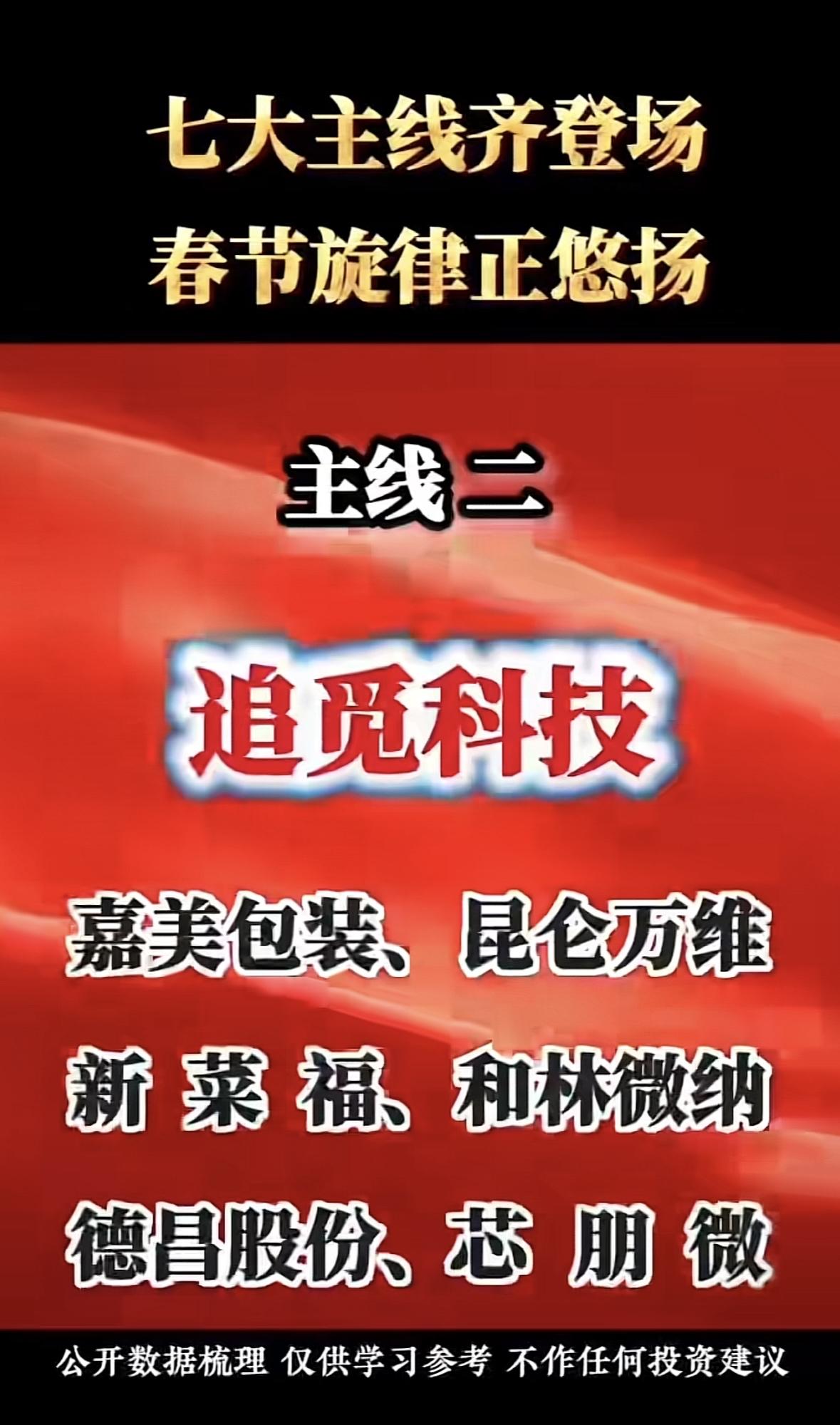 七大主线齐登场,春节行情正悠扬! 春节行情七大主线启动,腾讯元宝领衔科技股,数据与基建板块跟涨,仅供学习参考。 春节行情启动,七大主线轮动。科技股领涨,数据与AI概念活跃。市场热情升温,投资需理性。