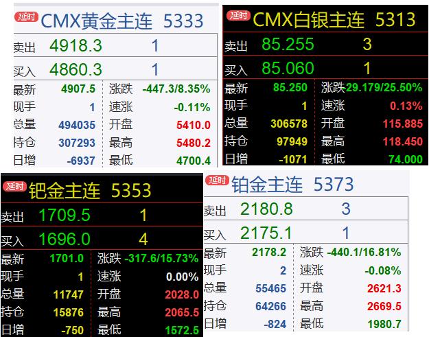 如果黄金暴跌,你会买吗? 周五贵金属遭遇史诗级的大暴跌, 黄金白银钯金钯金,你跌我跌,大家一起跌。 甚至白银盘中跌至74美元附近, 相当于暴跌36%,创下近四十年历史。 给大家看一个综合对比图吧, 希望大家从中得到些警示。 没有只涨不跌的市场,风险和收益并存! 通过下图,可以看出: 纽约黄金下跌8.35%; 纽约白银下跌25.5%; 纽约钯金跌幅15.73%; 纽约铂金跌幅16.81%。 您是否被这么大的跌幅给吓到?