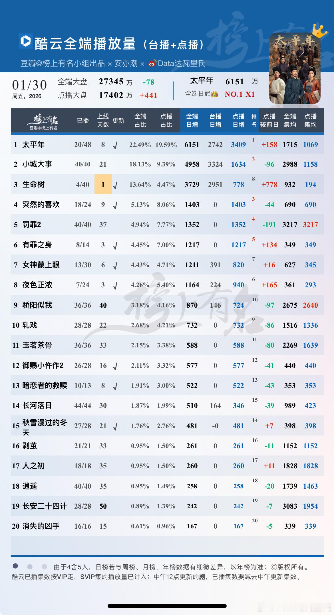 1.30酷云播放量太平年 酷云全端播放量登顶👑,点播端第一罚罪2 集均破3200万生命树首播全端3729,点播端778万生命树
